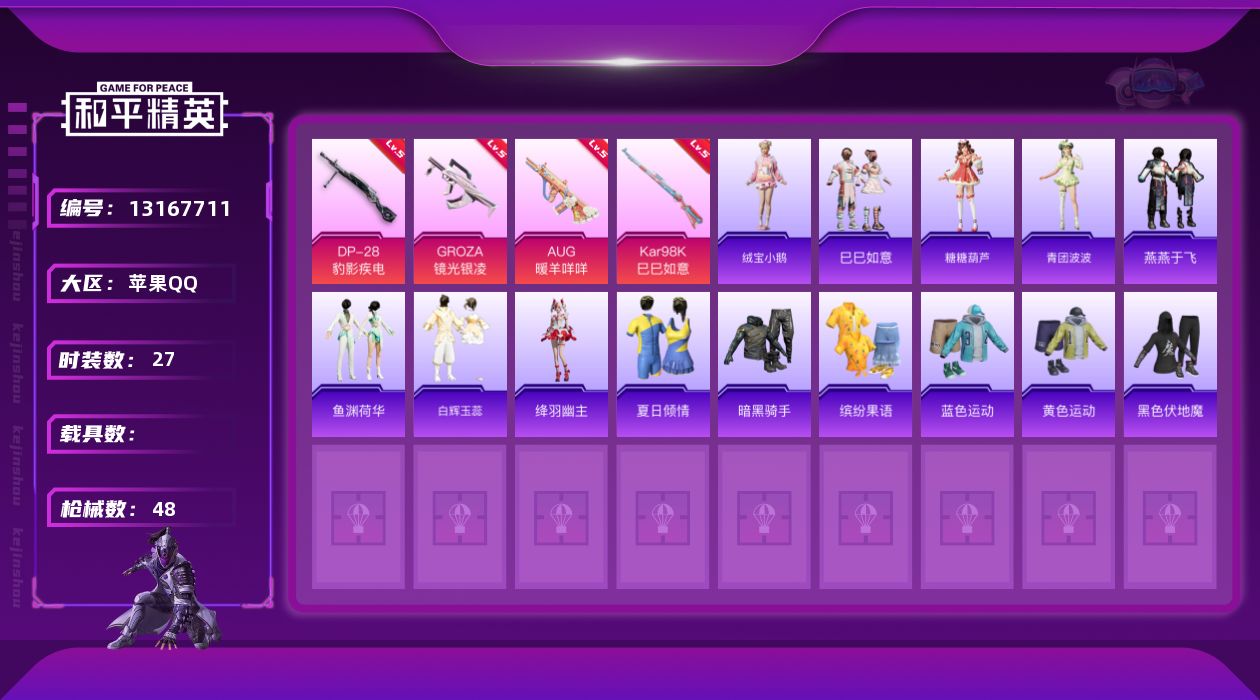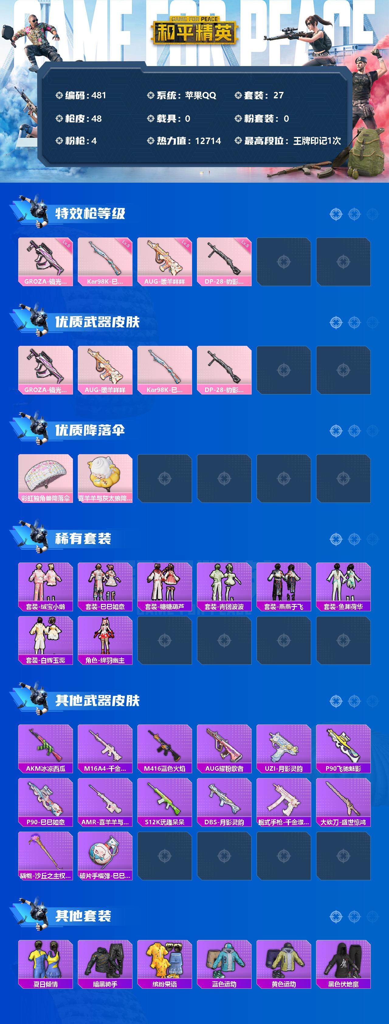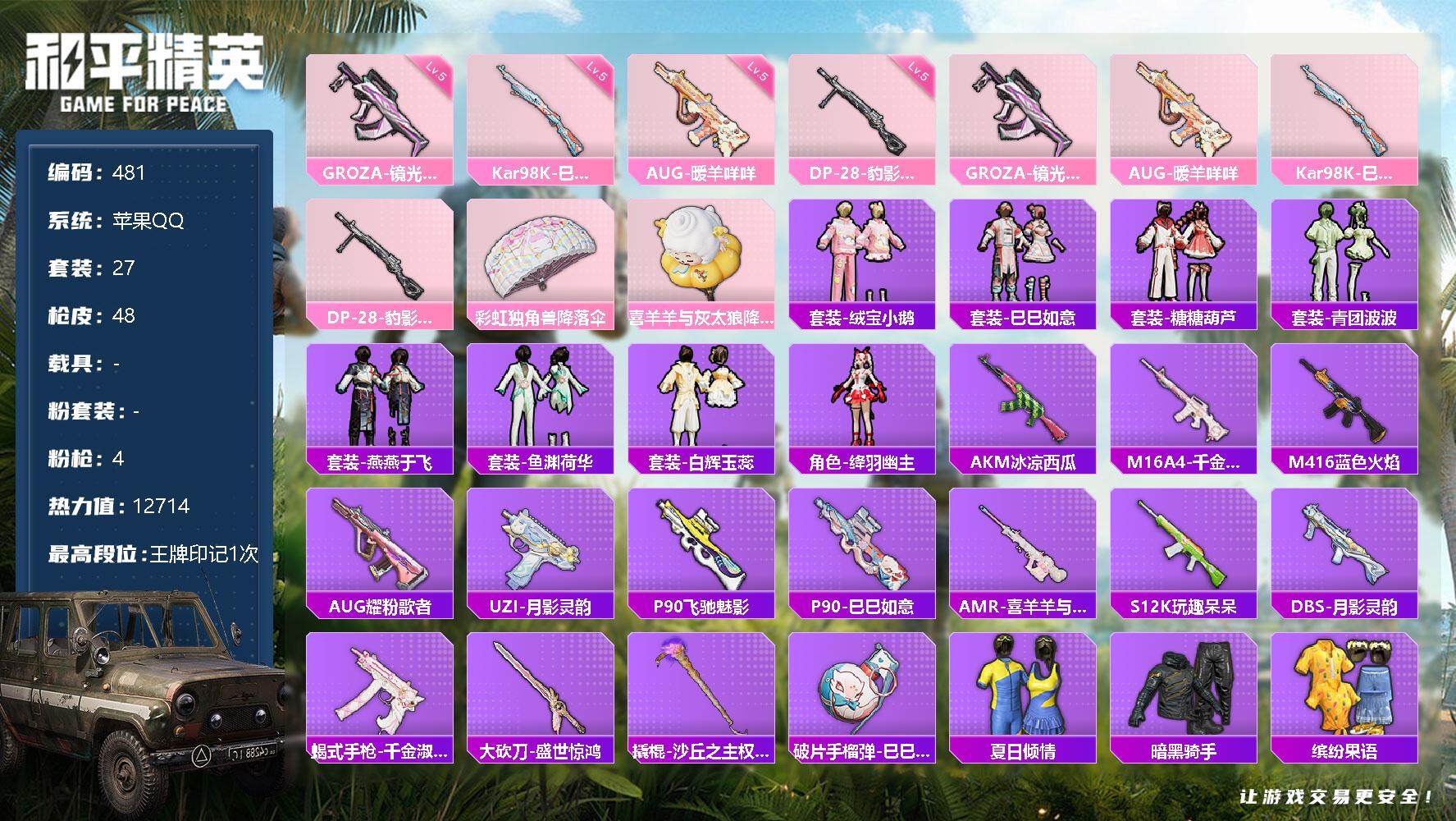 【11066800】[13167711]苹果 手Q-0粉装-4特效枪-0载具-0粉色飞行器-12714热力值-1王牌印记-27套装-48枪皮【粉色枪皮等级】:GROZA-镜光银凌(五级),AUG-暖羊咩咩(五级),Kar98K-巳巳如意(五级),DP-28-豹影疾电(五级)【粉色枪皮】:GROZA-镜光银凌,AUG-暖羊咩咩,Kar98K-巳巳如意,DP-28-豹影疾电【粉色降落伞】:彩虹独角兽
