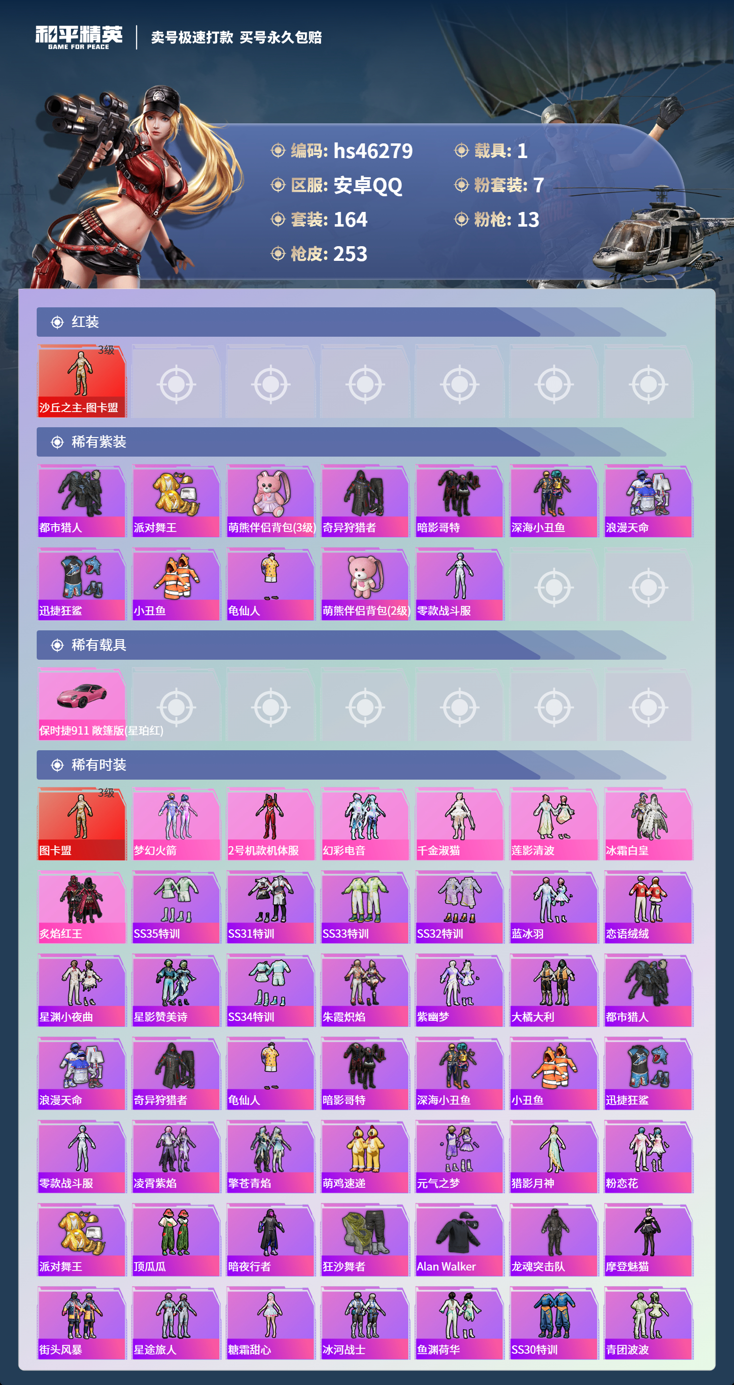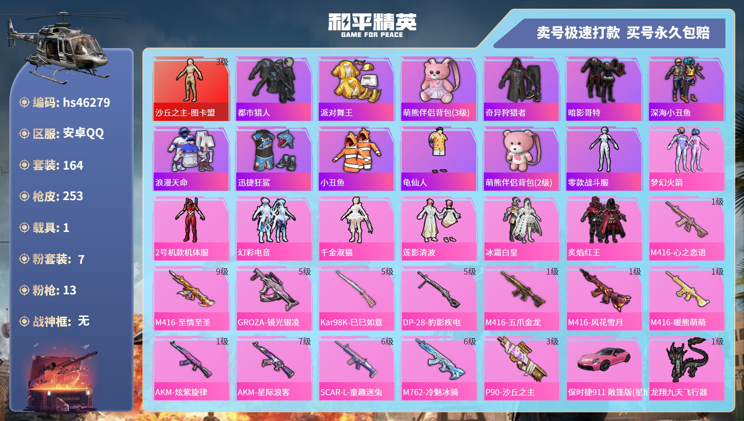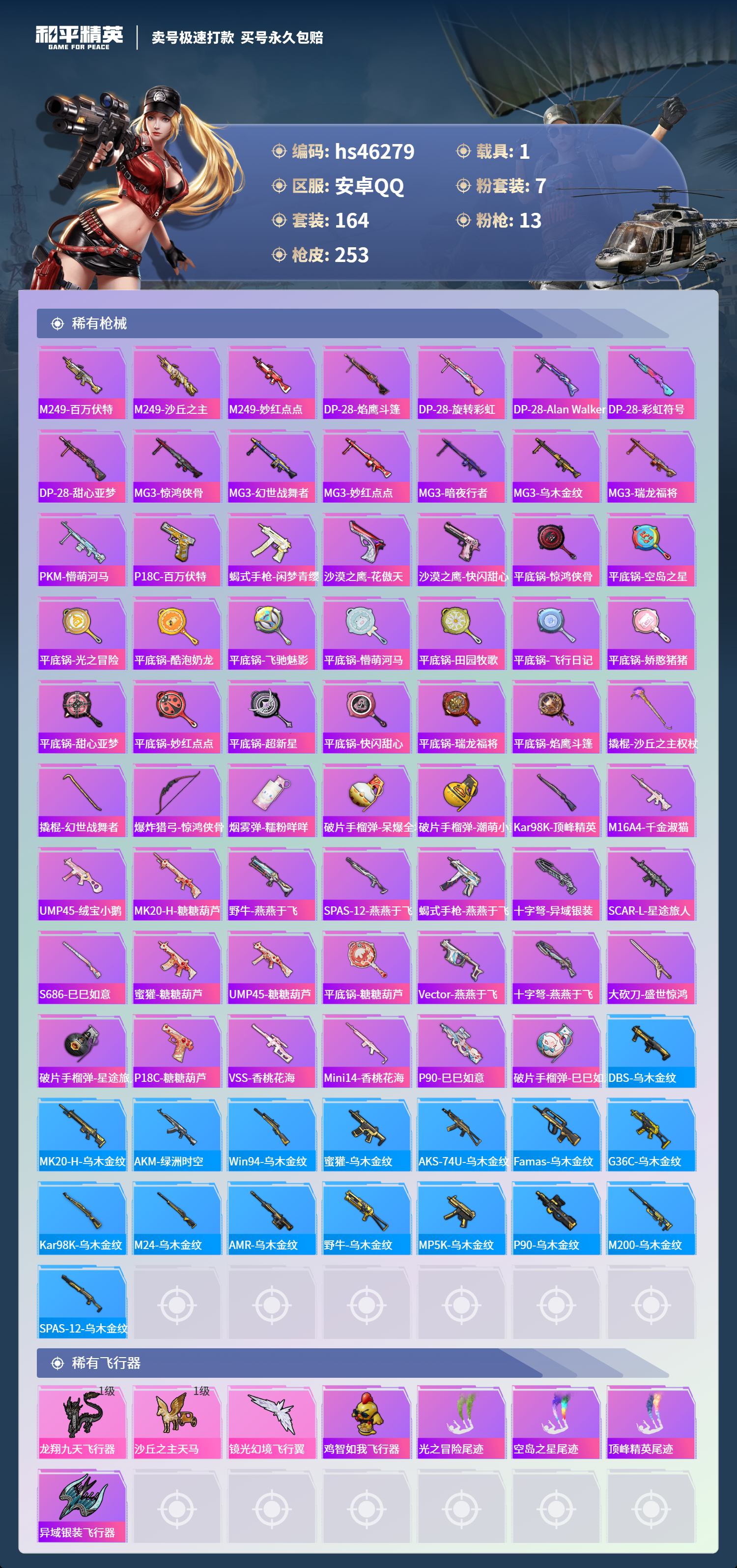 【11066895】【不可二次】【安卓QQ】龟仙人 AKM-星际浪客 M416-五爪金龙 漫步者 P90-沙丘之主 都市猎人 炙焰红王 沙丘之主-图卡盟 M416-至情至圣 M416-暖熊萌萌 M416-心之恋语 深海小丑鱼 SCAR-童趣迷兔 瑞龙福将 浪漫天命 AWM-黄金龙骨 镜光幻境飞行翼 团圆交子 迅捷狂鲨 奇异狩猎者 M762-瑞龙福将 狂沙舞者 龙翔九天飞行器 AKM-炫紫旋律 M