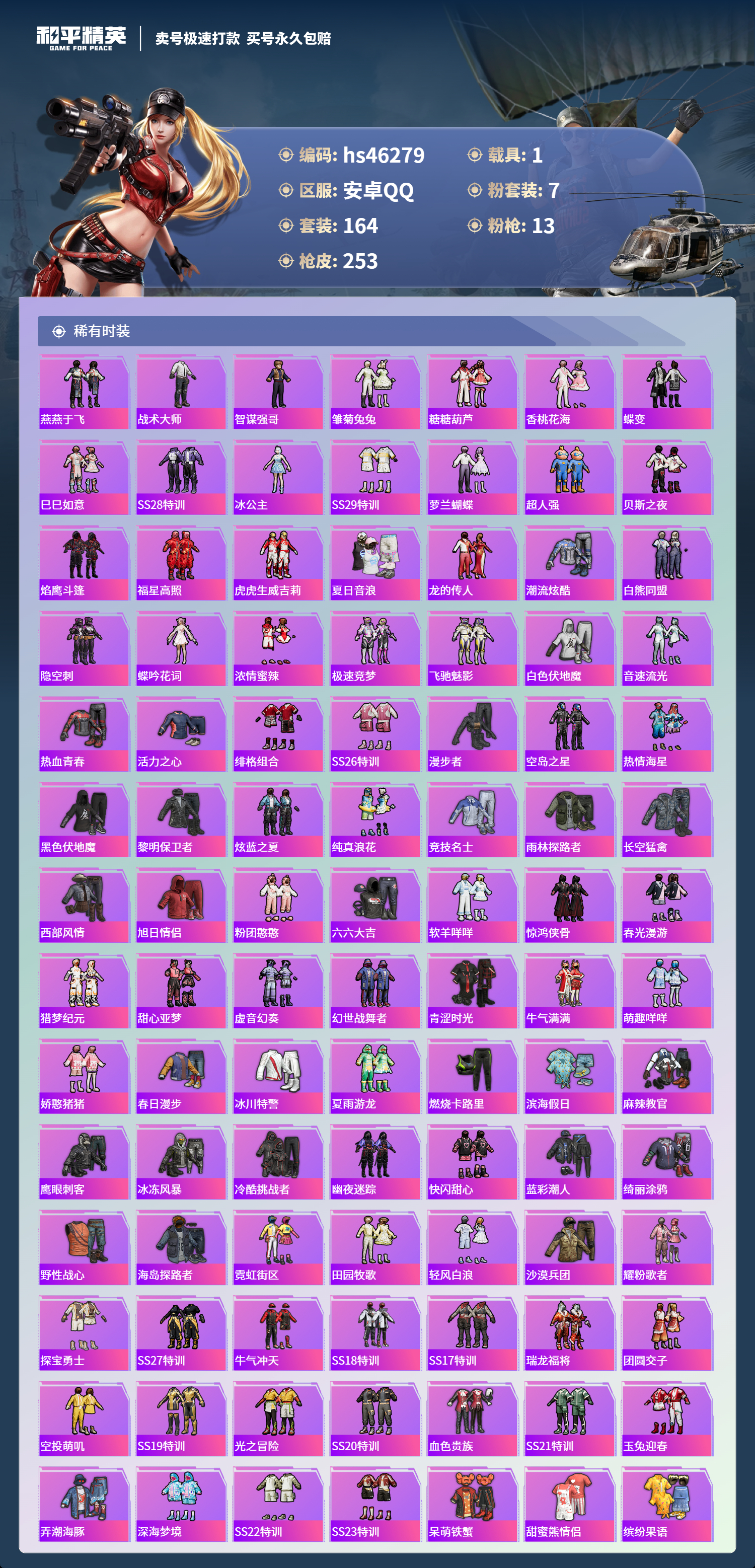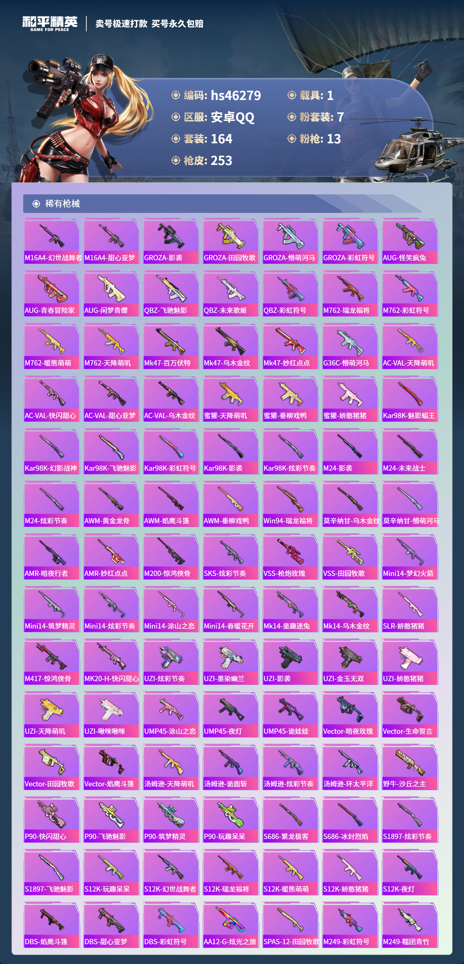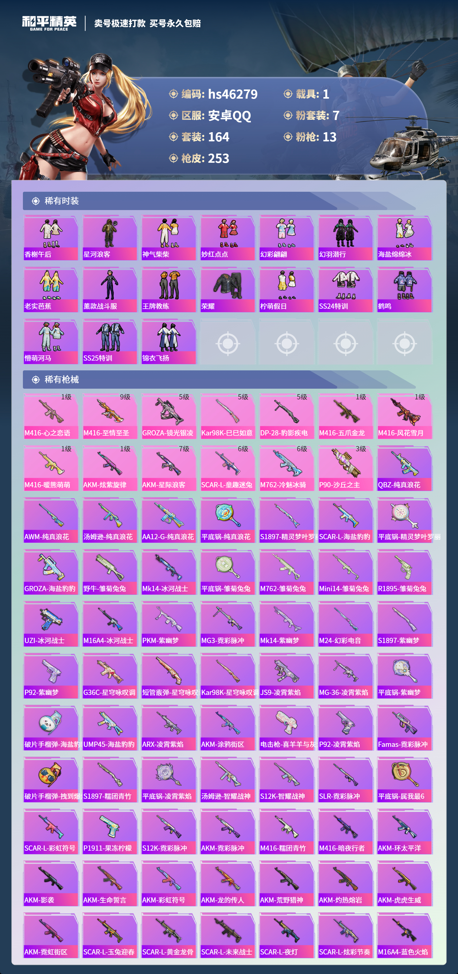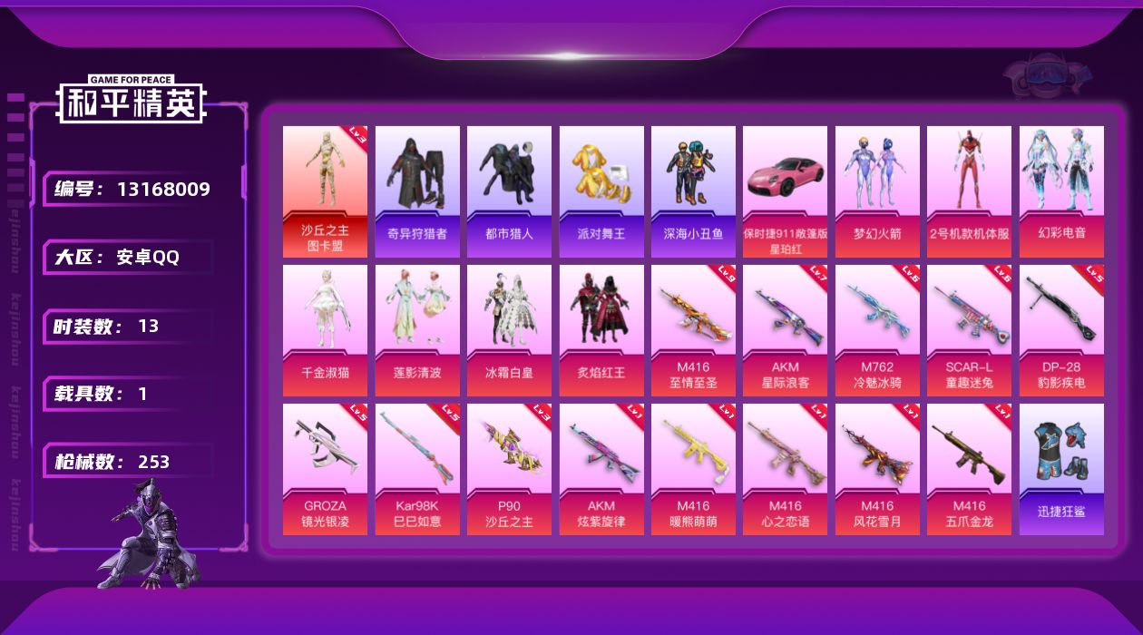 【11066895】【不可二次】【安卓QQ】龟仙人 AKM-星际浪客 M416-五爪金龙 漫步者 P90-沙丘之主 都市猎人 炙焰红王 沙丘之主-图卡盟 M416-至情至圣 M416-暖熊萌萌 M416-心之恋语 深海小丑鱼 SCAR-童趣迷兔 瑞龙福将 浪漫天命 AWM-黄金龙骨 镜光幻境飞行翼 团圆交子 迅捷狂鲨 奇异狩猎者 M762-瑞龙福将 狂沙舞者 龙翔九天飞行器 AKM-炫紫旋律 M