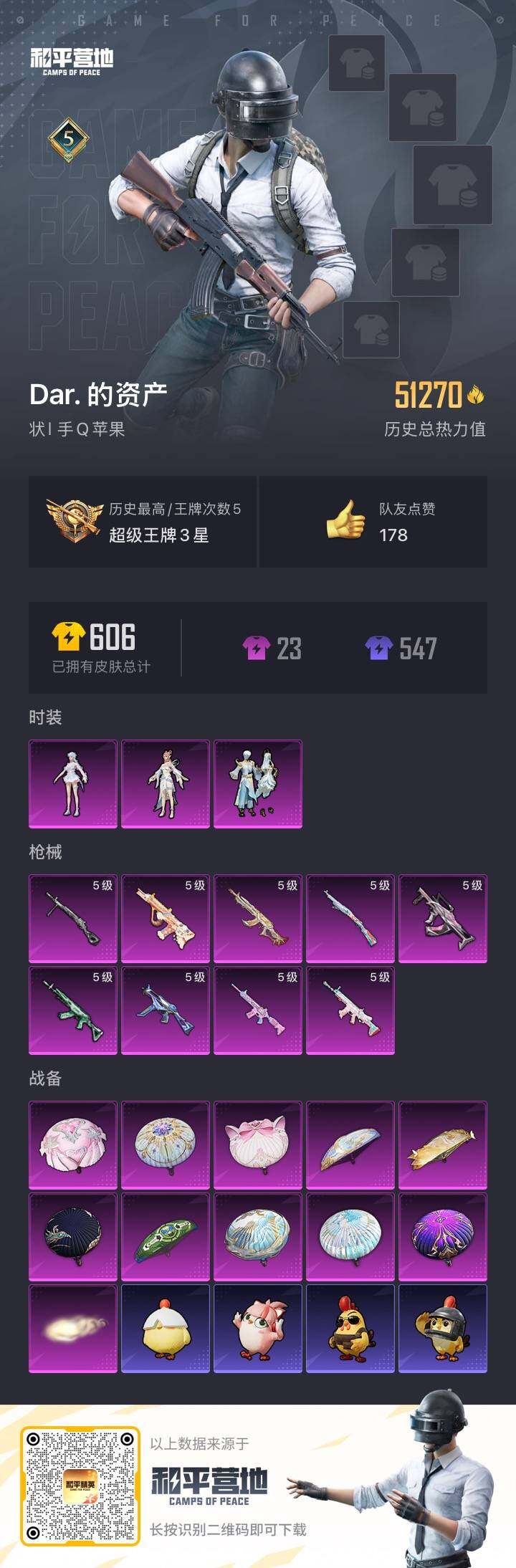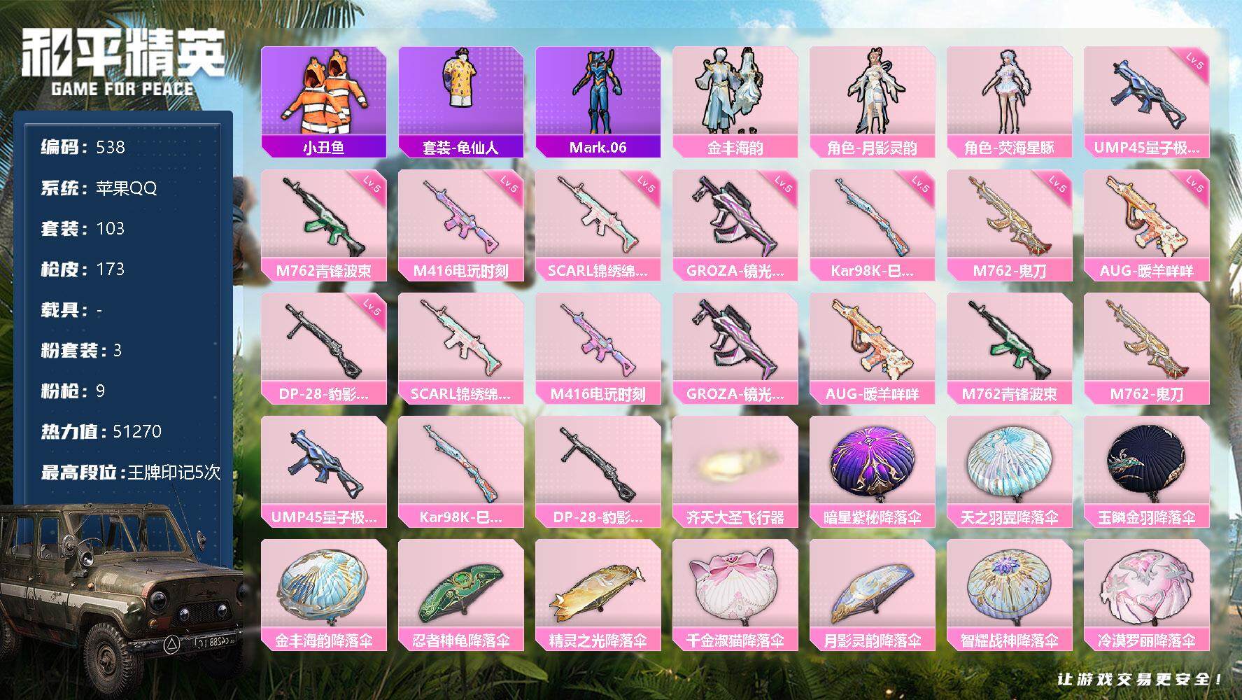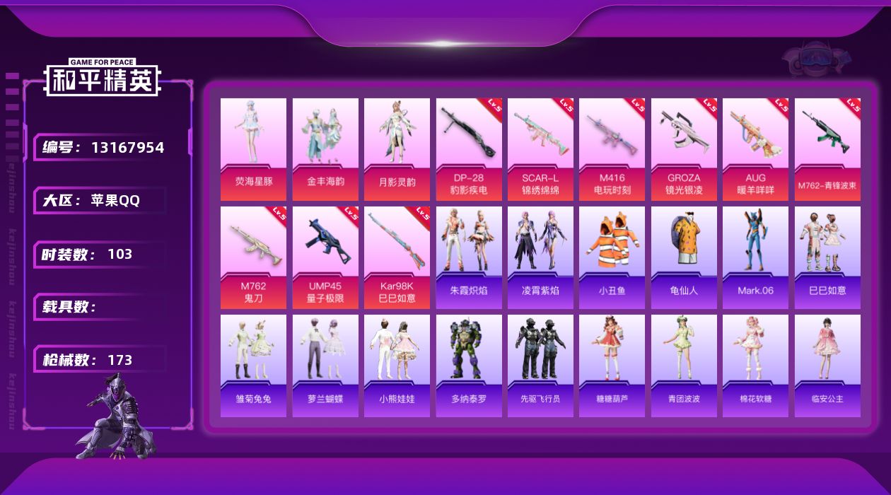 【11066916】[13167954]苹果 手Q-3粉装-9特效枪-0载具-1粉色飞行器-51270热力值-5王牌印记-103套装-173枪皮【热门品类】:套装-小丑鱼,套装-龟仙人,角色-Mark.06【粉色套装】:粉装-金丰海韵,角色-月影灵韵,角色-荧海星豚【粉色枪皮等级】:SCAR-L-锦绣绵绵(五级),M416-电玩时刻(五级),GROZA-镜光银凌(五级),AUG-暖羊咩咩(五级)