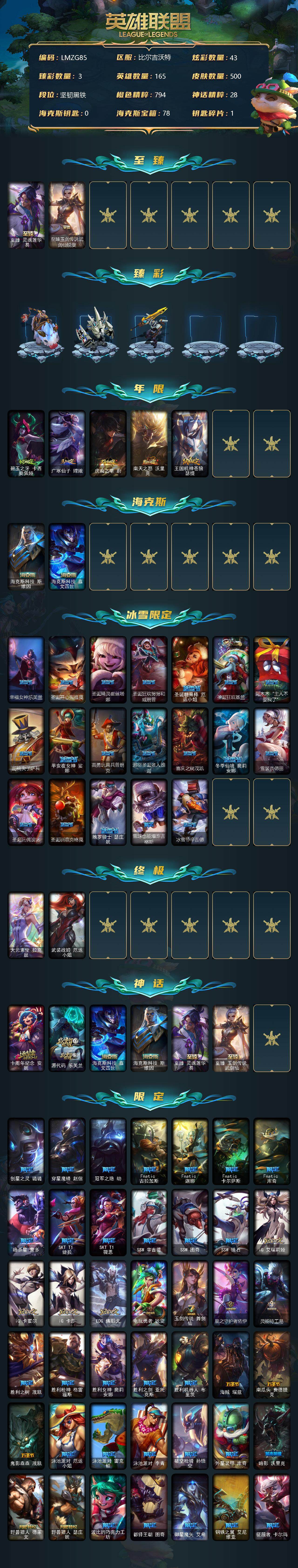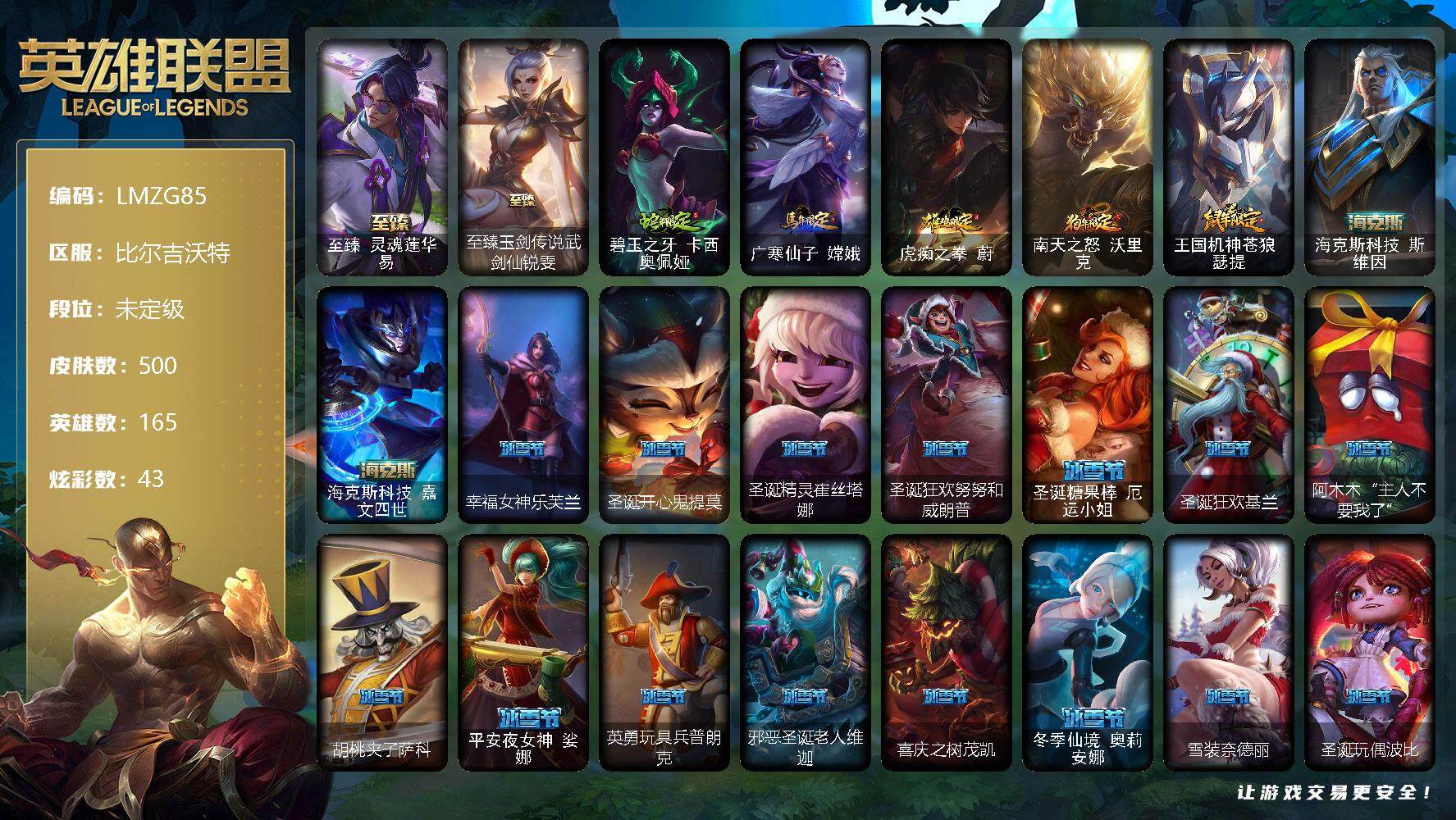 【11070219】【LMZG85】165英雄/500皮肤/2终极/6神话/71限定/3臻彩/43炫彩/55传说/137史诗/未定级/至臻灵魂莲华易/至臻玉剑传说武剑仙/无畏骑士瑟庄妮赤子初心/霸天巨兽雪崩墨菲特/霸天剑魔亚托克斯涤罪之翼/碧玉之牙卡西奥佩娅/广寒仙子嫦娥/虎痴之拳蔚/南天之怒沃里克/王国机神苍狼瑟提/海克斯科技斯维因/海克斯科技嘉文四世/幸福女神乐芙兰/圣诞开心鬼提莫/圣诞精灵