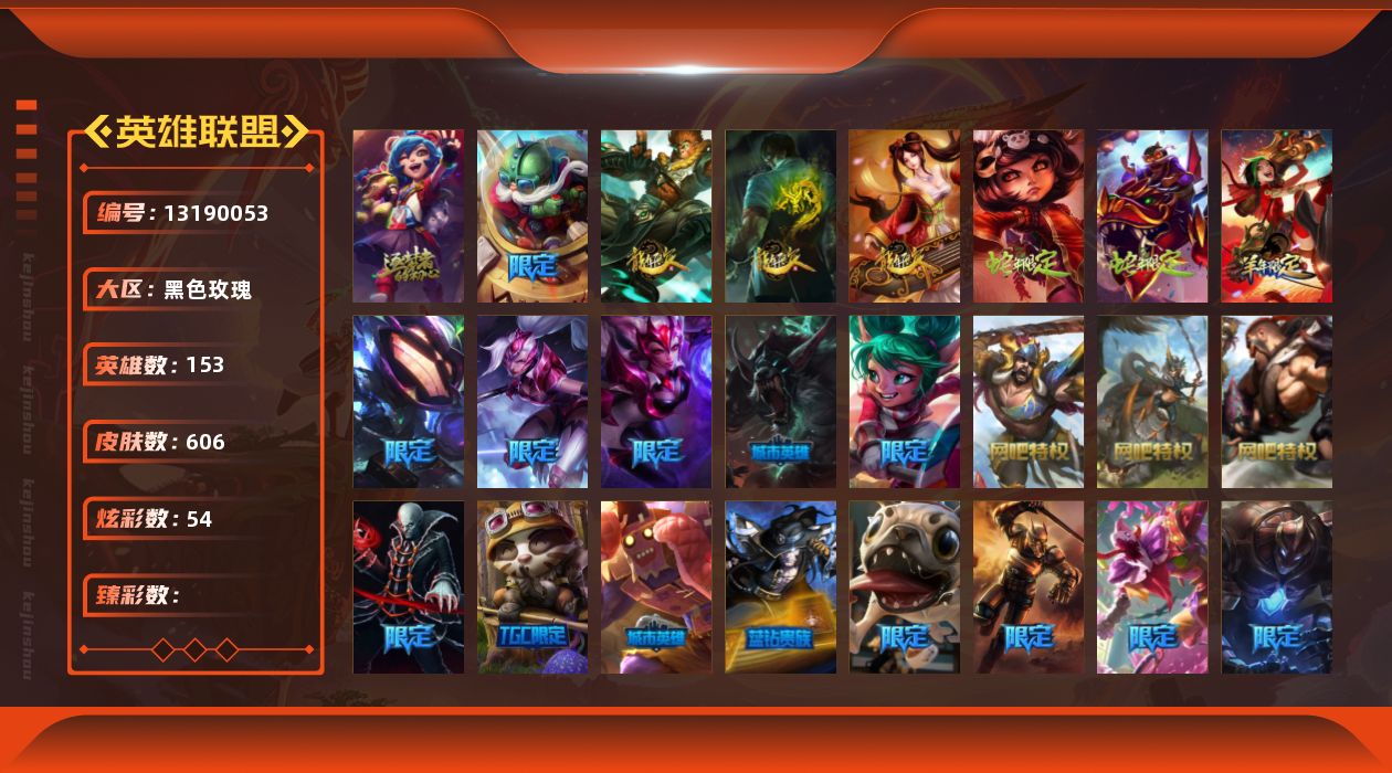 【11071511】1神话 104限定 58传说 157史诗 606皮肤 54炫彩 153英雄 可二次 可修改实名 【限定】:哥特萝莉 安妮,生化领主 泰达米尔【情人节限定】:觅心女王 艾希,觅心游侠 卢锡安,甜心之羽 霞【冠军限定系列】:S1FNC 酒桶,S1FNC 迦娜,S1FNC 嘉文四世,S1FNC 卡尔萨斯,S1FNC 库奇,S2 暗杀星 蒙多,S2 暗杀星 努努,S2 暗杀星 慎,S