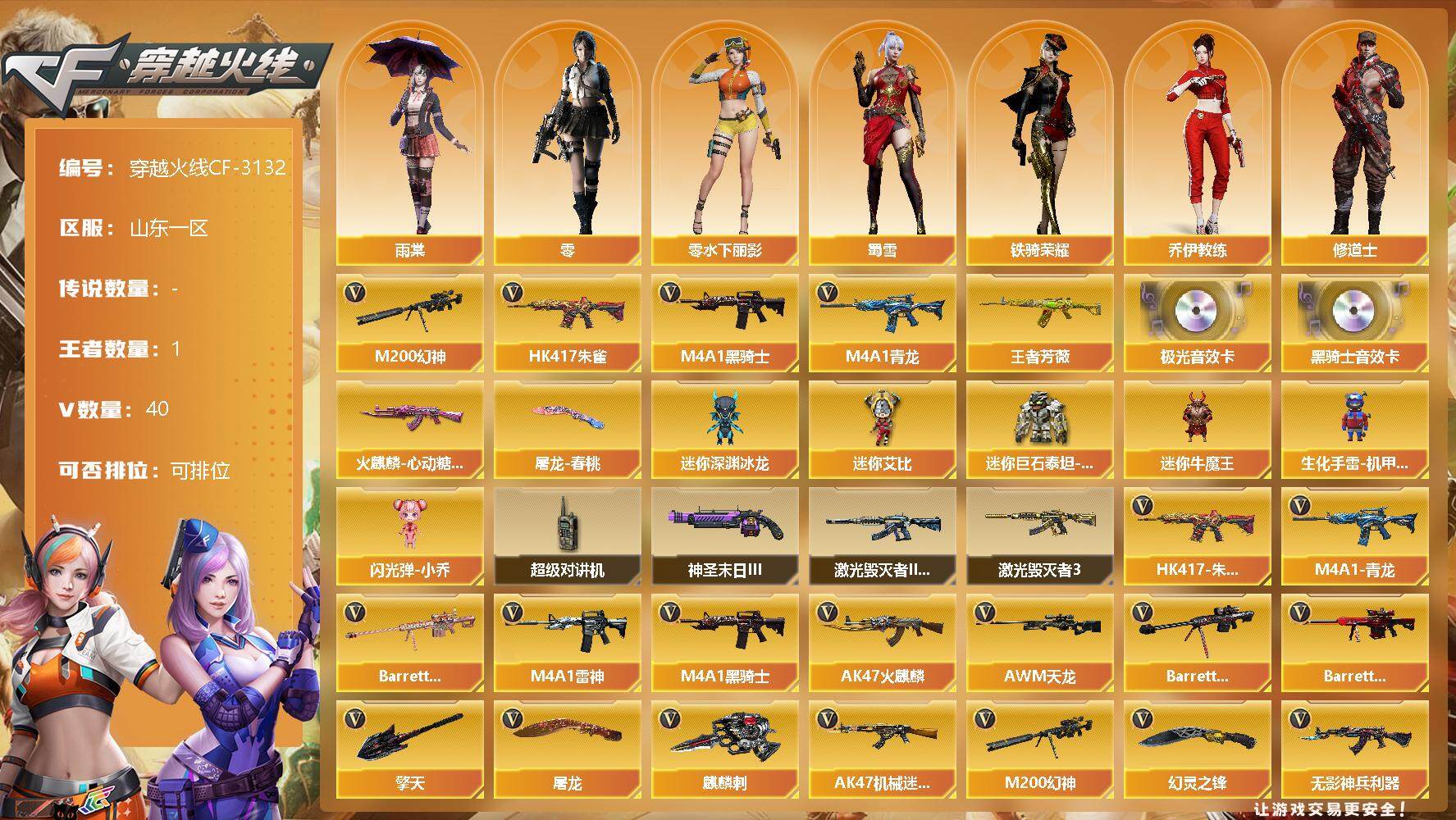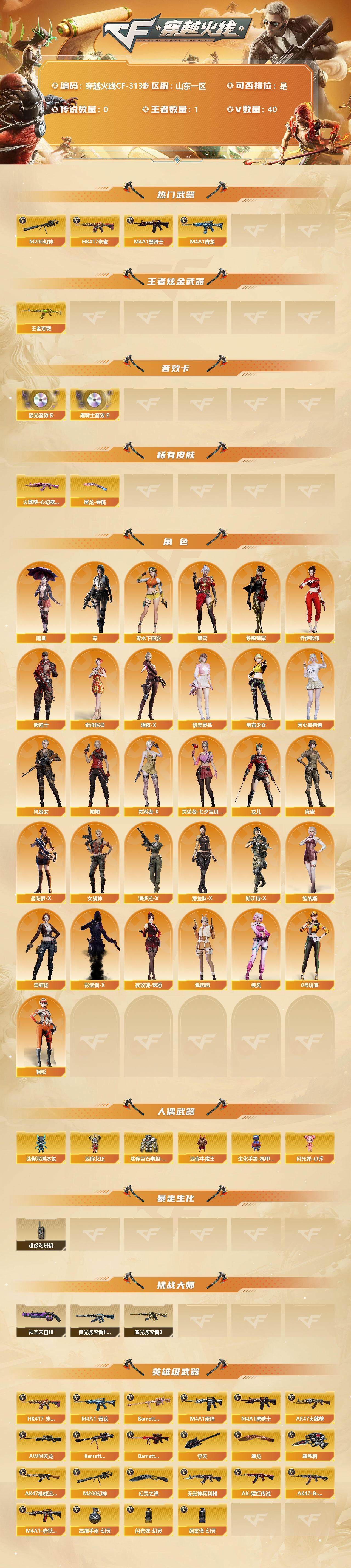【11074379】【11074379】山东一区-40V-1王者-0炫金【热门武器】:HK417-朱雀,M4A1-青龙,M200-幻神,M4A1-黑骑士【王者