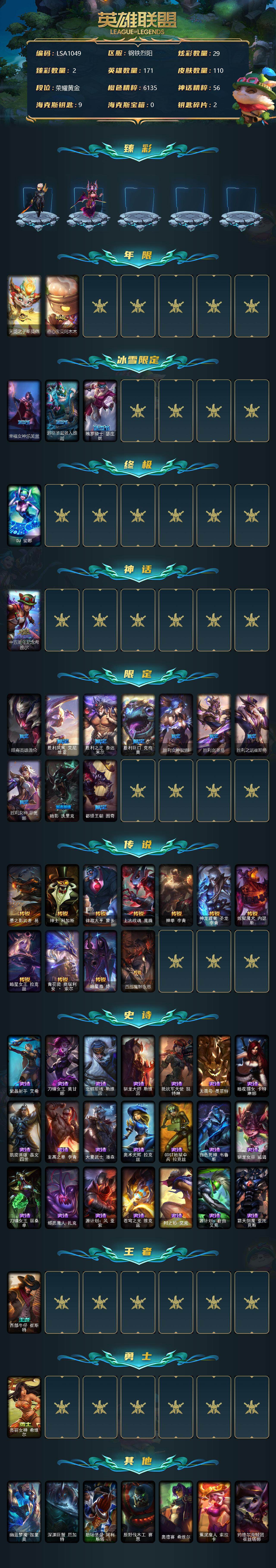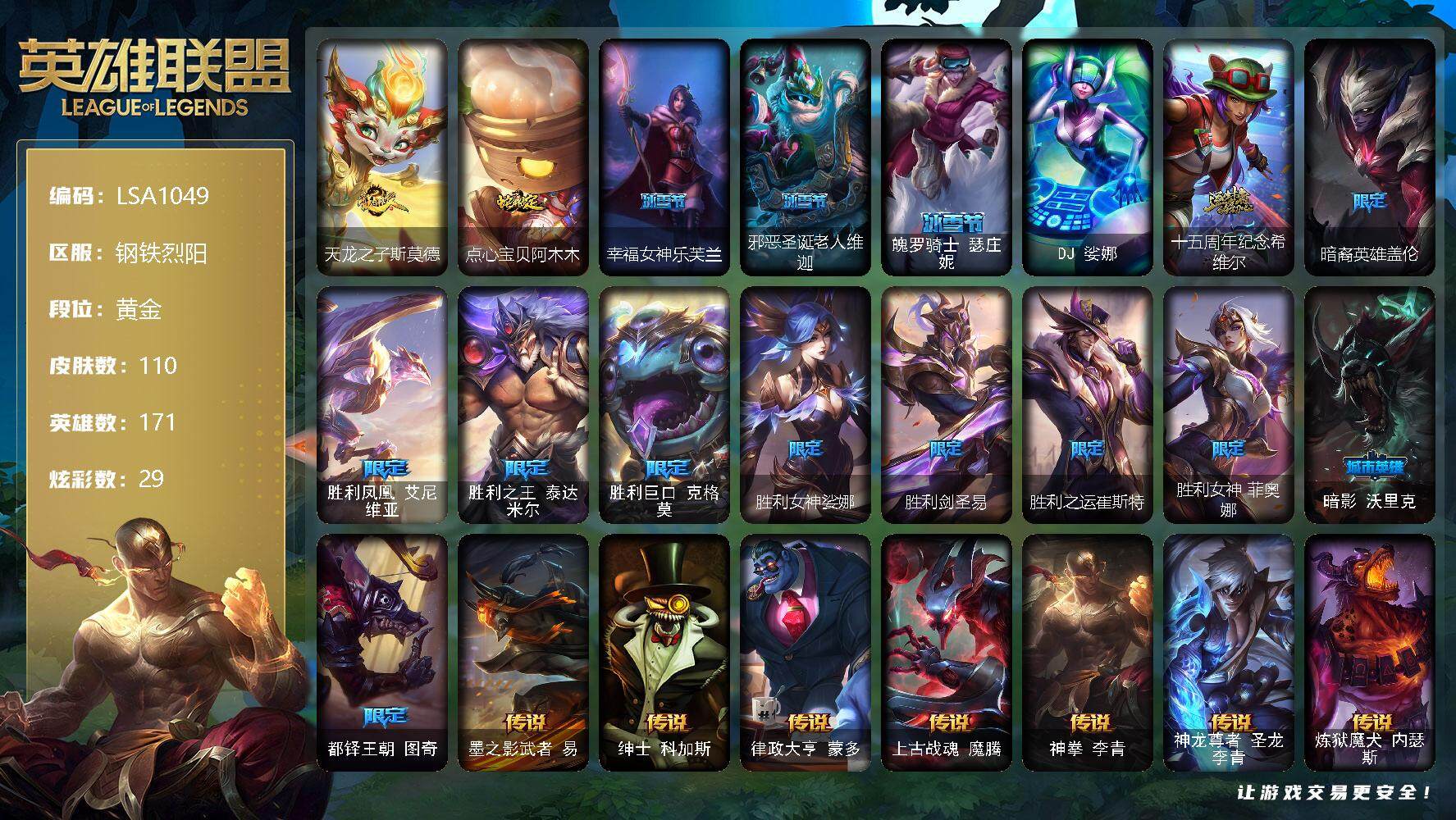 【11083793】【LSA1049】171英雄/110皮肤/1终极/1神话/15限定/2臻彩/29炫彩/11传说/21史诗/黄金账号等级:491/源计划火菲奥娜惩戒/星之吞噬者莫甘娜热情之末/天龙之子斯莫德/点心宝贝阿木木/幸福女神乐芙兰/邪恶圣诞老人维迦/魄罗骑士瑟庄妮/DJ娑娜/十五周年纪念希维尔/暗裔英雄盖伦/胜利凤凰艾尼维亚/胜利之王泰达米尔/胜利巨口克格莫/胜利女神娑娜/胜利剑圣易/
