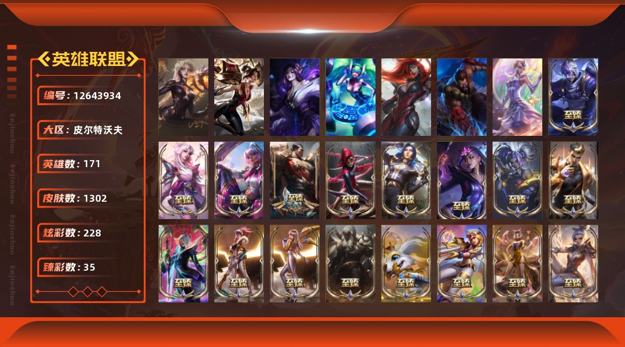 【11086260】[12643934]t26008【皮尔特沃夫】签名版联盟不朽卡莎 殿堂传奇卡莎 灵魂莲华莫甘娜 1302皮肤 228炫彩 35臻彩 59神话/205限定/128传说/171英雄 账号等级:863 云顶神话:2 单双排段位:璀璨钻石 【重要头像】云顶战斗学院伊泽瑞尔 云顶古琴娑娜 爱意绵绵 雪花 银河魔装机神安妮 大家伙 泳池派对佐伊 KDA萨勒芬妮 塞巴斯蒂安 伊纳 星守金克