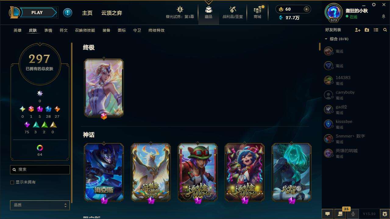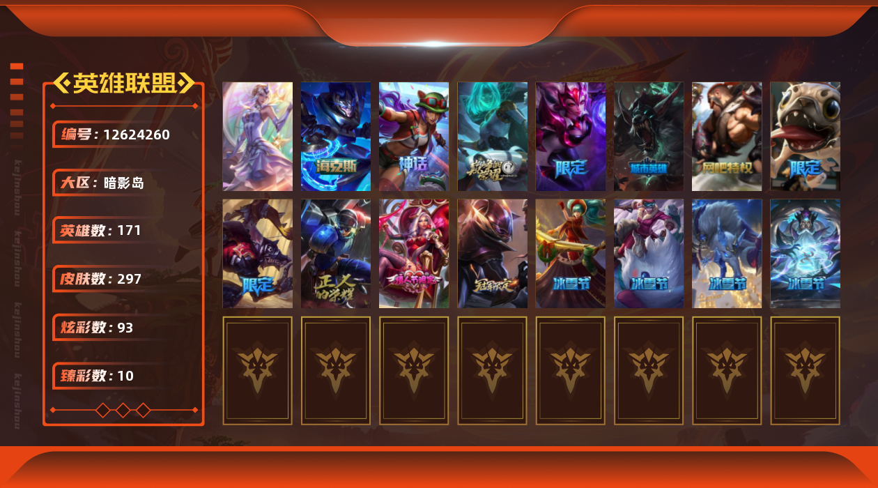 【11086272】[12624260]t28225【暗影岛】297皮肤 93炫彩 10臻彩 5神话/28限定/27传说/171英雄 账号等级:573【重要皮肤】海克斯科技嘉文四世 胜利女神希维尔 荣誉使者玛尔扎哈 玉剑传说舞龙卫 天龙之子斯莫德 胜利之树茂凯 胜利女神奥莉安娜 胜利枪神格雷福斯 胜利之剑亚托克斯 觅心女王艾希 北极星圣贤基兰 狂心冰王图奇 魄罗骑士瑟庄妮