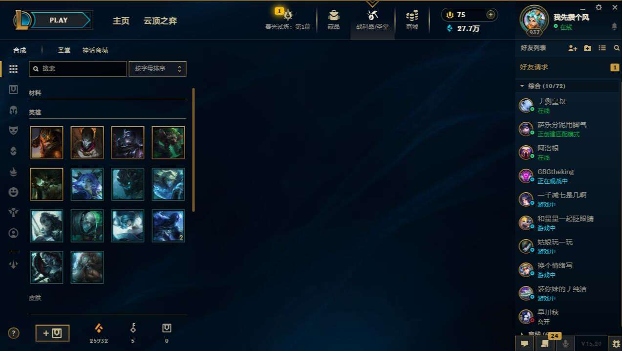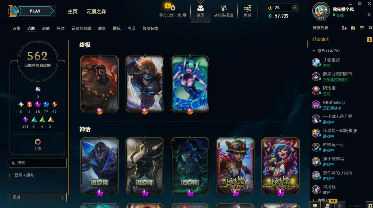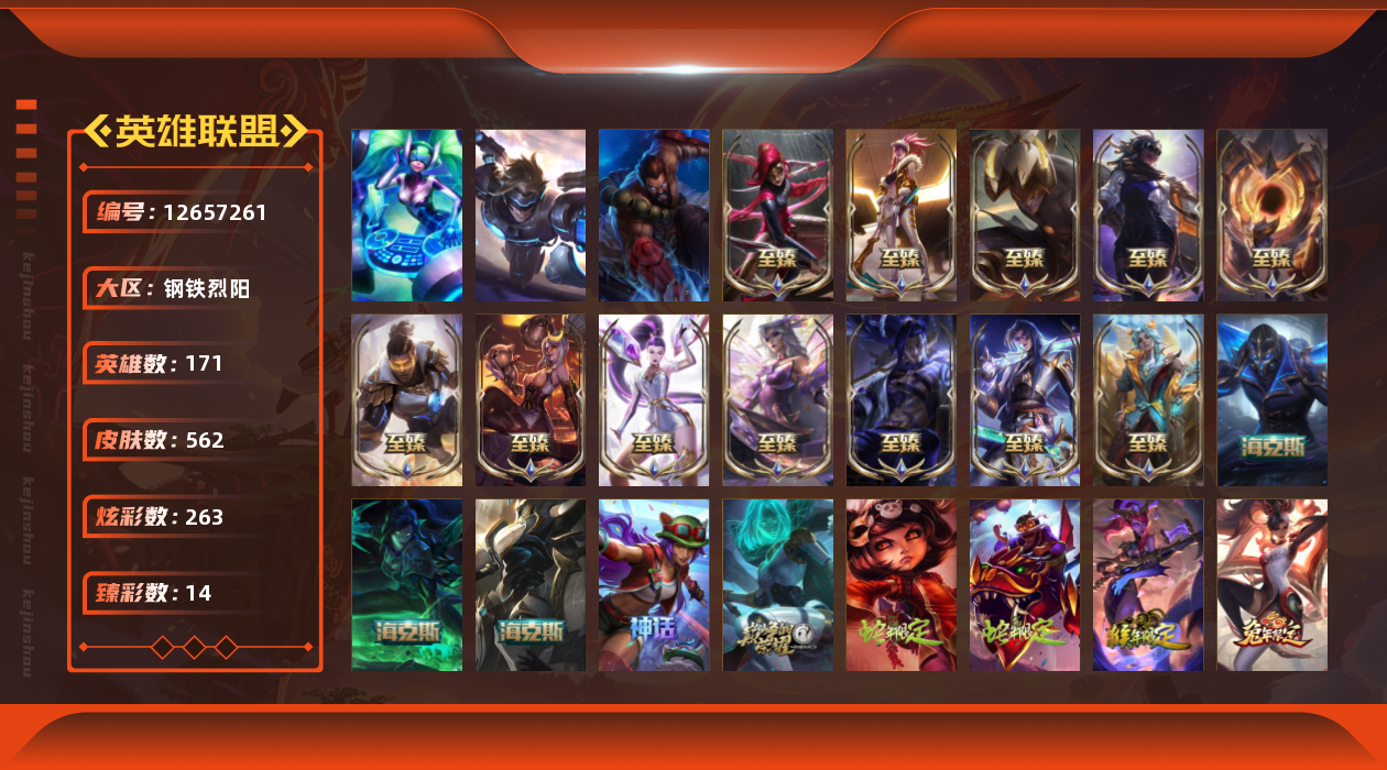 【11086473】[12657261]t28281【钢铁烈阳】562皮肤 263炫彩 14臻彩 18神话/77限定/67传说/171英雄 账号等级:937 单双排段位:铂金【重要头像】可爱悠米 烈焰美人薇恩 披萨鸡 送披萨的小姐姐希维尔 【重要皮肤】黑色玫瑰假面舞会卡特琳娜至臻 天龙之子伊泽瑞尔至臻 心之钢永恩至臻 墨之影武者亚索至臻 花仙使者卡特琳娜至臻 未来战士卢锡安至臻