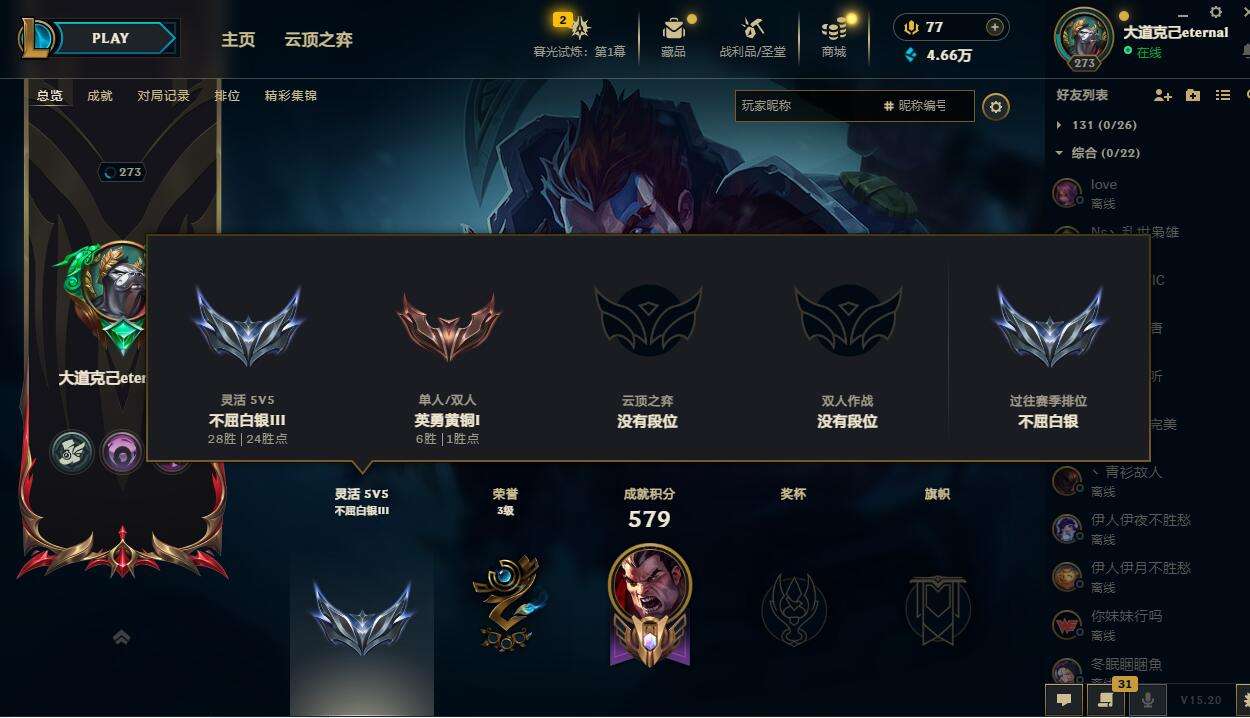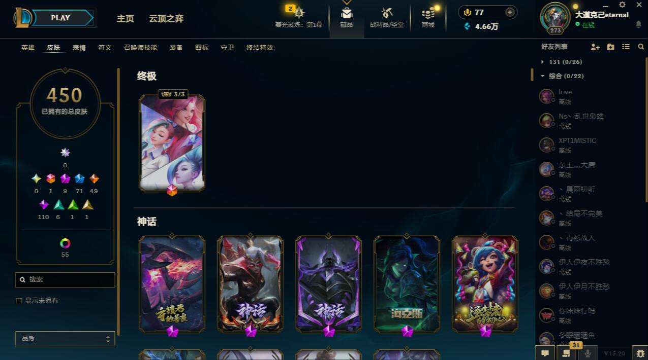 【11086521】[12658236]t28290【卡拉曼达】450皮肤 79炫彩 9臻彩 9神话/71限定/49传说/171英雄 账号等级:273 云顶神话:1 单双排段位:青铜【重要头像】爱情鸽 萨勒芬妮超级巨星 萨勒芬妮独立音乐人 战斗学院悠米 战斗学院伊泽瑞尔 真实伤害艾克 真实伤害赛娜 【重要皮肤】北极星使者沃里克至臻 未来战士卢锡安至臻 真实伤害亚索至臻 魅惑女
