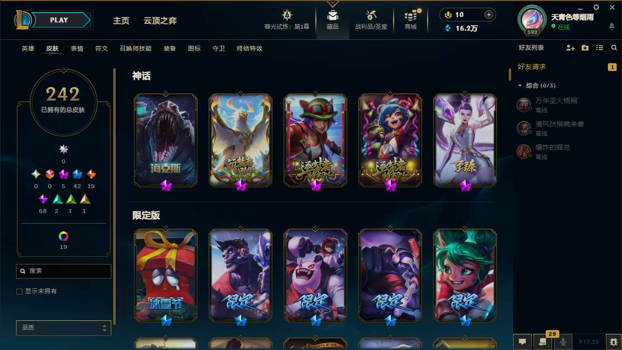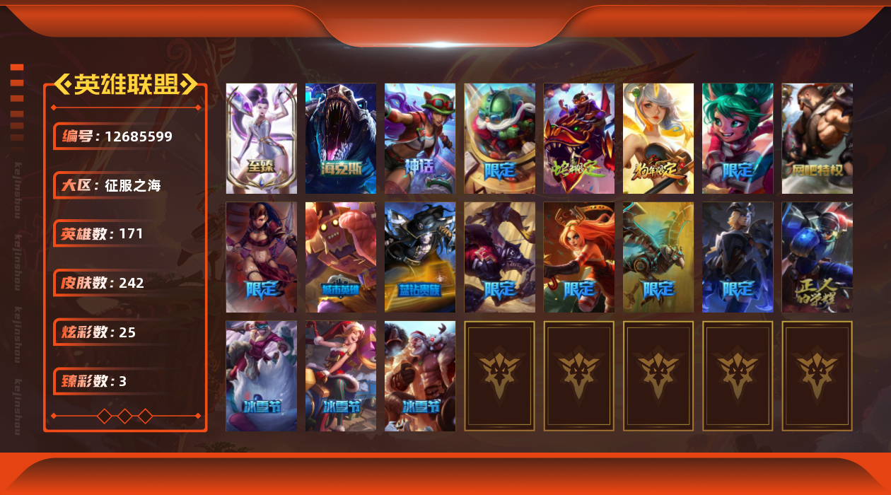 【11086531】[12685599]t28319【征服之海】242皮肤 25炫彩 3臻彩 5神话/42限定/19传说/171英雄 账号等级:592 单双排段位:铂金【重要头像】战斗学院拉克丝 勇者阿狸炫金 沐浴震惊 【重要皮肤】KDA二代卡莎至臻 海克斯科技雷克顿 胜利女神娑娜 胜利女神希维尔 胜利之王泰达米尔 胜利巨口克格莫 古琴余韵娑娜 春晖神女拉克丝 神龙之翼库奇
