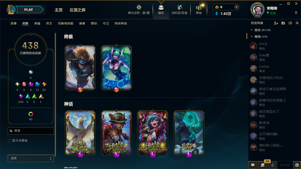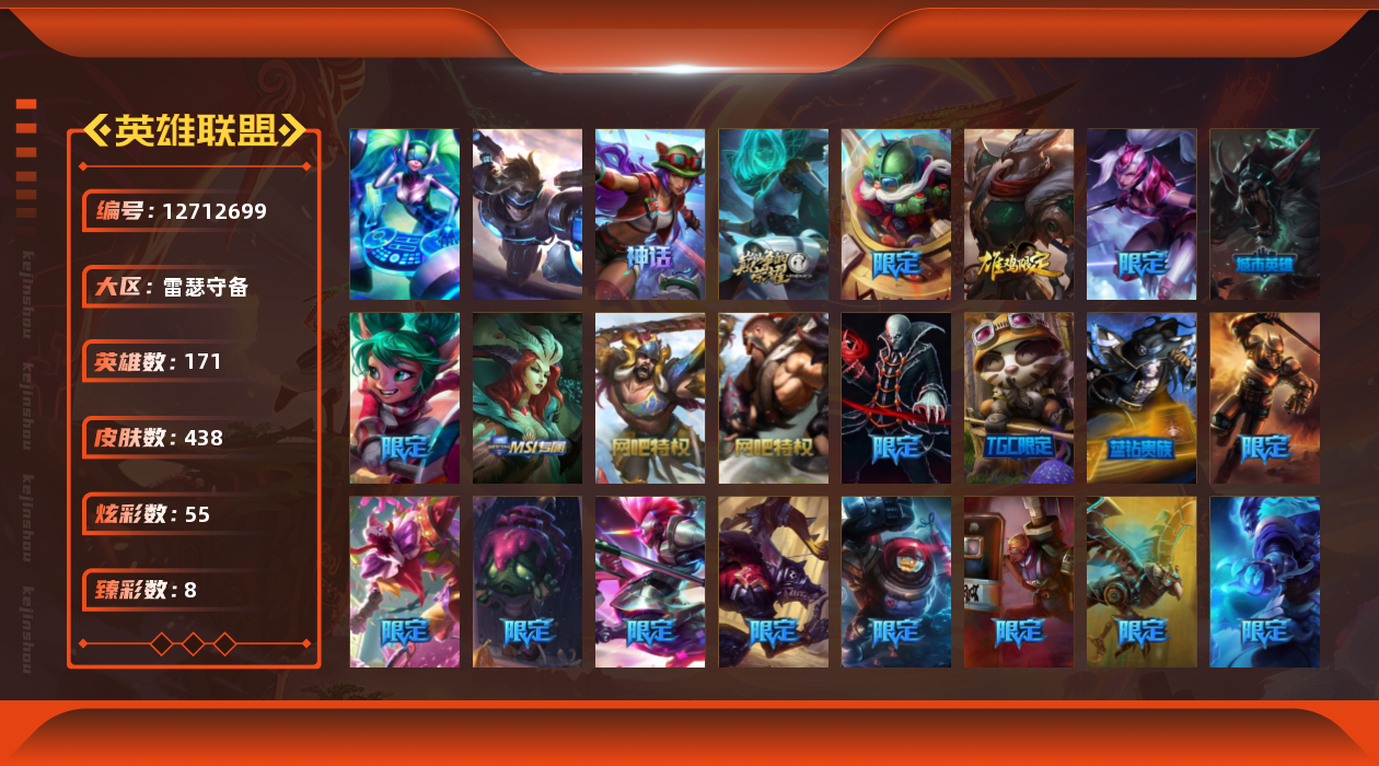 【11086632】[12712699]t28404【雷瑟守备】438皮肤 55炫彩 8臻彩 4神话/71限定/31传说/171英雄 账号等级:483【重要头像】云顶古琴娑娜 此志无双羽饰骑士 【重要皮肤】胜利之王泰达米尔 安妮梦游仙境 勇敢的心德莱厄斯 电玩勇者锐雯 点心宝贝阿木木 天龙之子斯莫德 司马懿仲达 胜利机器人布里茨 胜利女神奥莉安娜 胜利枪神卢锡安 胜利之剑