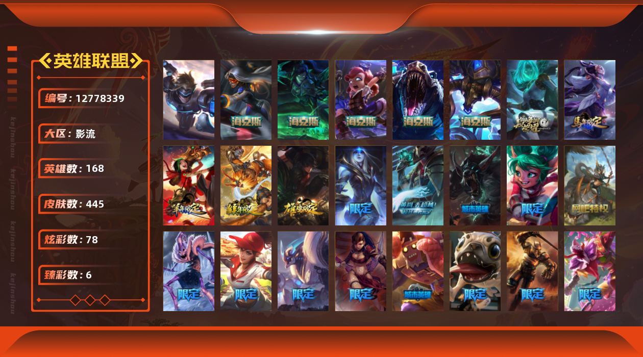 【11086744】[12778339]t28520 皇冠账号【影流】445皮肤 78炫彩 6臻彩 7神话/72限定/35传说/168英雄 账号等级:231 单双排段位:黄金【重要头像】披萨鸡 送披萨的小姐姐希维尔 美猴王孙悟空 【重要皮肤】海克斯科技安妮 海克斯科技雷克顿 海克斯科技阿利斯塔 摄魂使者薇恩 新创战纪希维尔 胜利剑圣易 胜利女神娑娜 胜利女神希维尔 胜利巨口