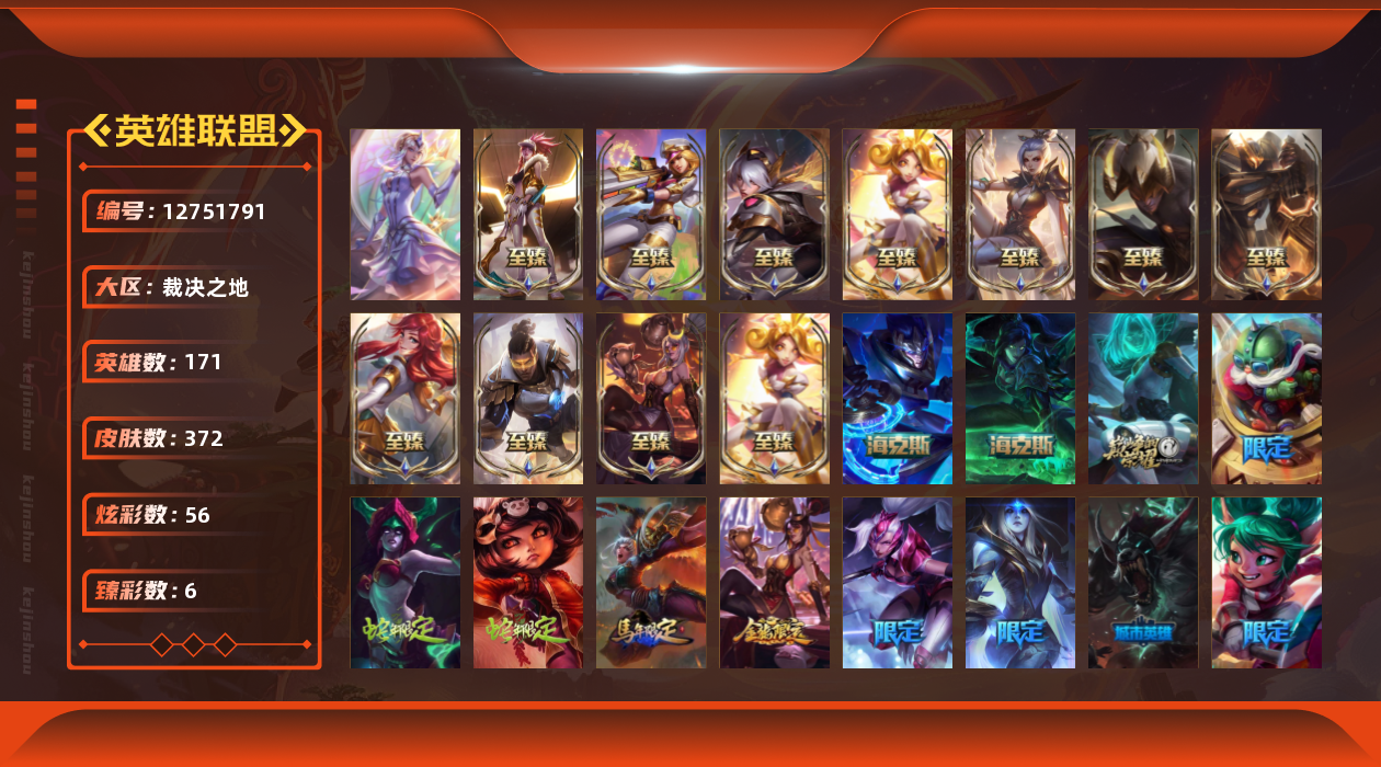 【11086844】[12751791]t28475【裁决之地】372皮肤 56炫彩 6臻彩 14神话/70限定/38传说/171英雄 账号等级:440 单双排段位:白银【重要头像】战斗学院拉克丝 玉剑传说寒潭夭夭炫彩 玉剑传说寒潭夭夭边框 玉剑传说苍鸾炫彩 玉剑传说苍鸾边框 泳池派对凯特琳 泳池派对佐伊 女帝卡特琳娜 烈焰美人薇恩 战斗学院杰斯 战斗学院伊泽瑞尔 真实伤害