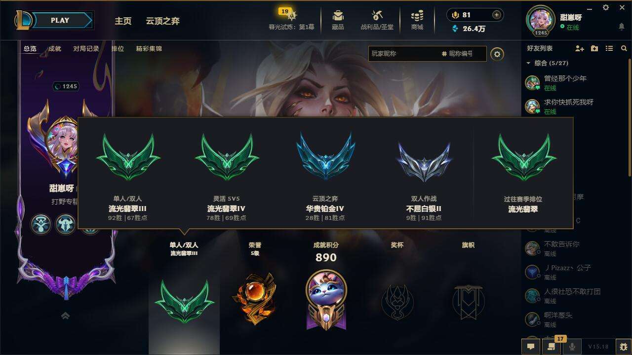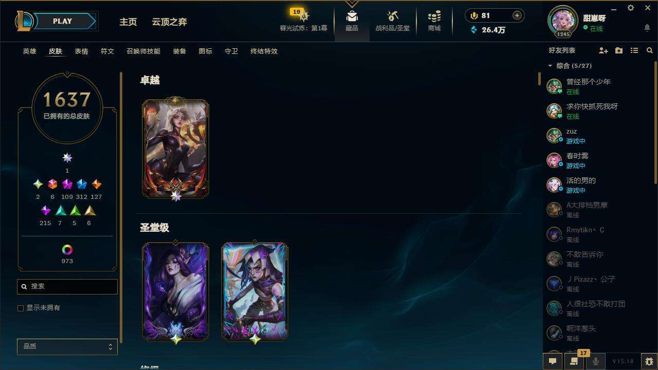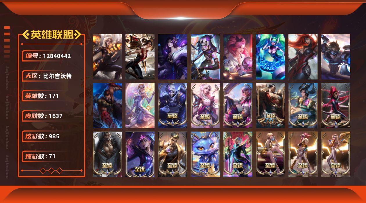 【11086897】[12840442]t26422【比尔吉沃特】联盟不朽卡莎 殿堂传奇卡莎 灵魂莲华莫甘娜 双城之战2破碎者金克丝 原皮龙瞎 1637皮肤 985炫彩 71臻彩 109神话/312限定/127传说/171英雄 账号等级:1245 云顶神话:2 单双排段位:翡翠 【重要头像】破碎金克丝头像 爱情鸽 爱情之歌 觅心射手 心型钥匙 大家伙 萨勒芬妮超级巨星 萨勒芬妮独立音乐人 卡特琳