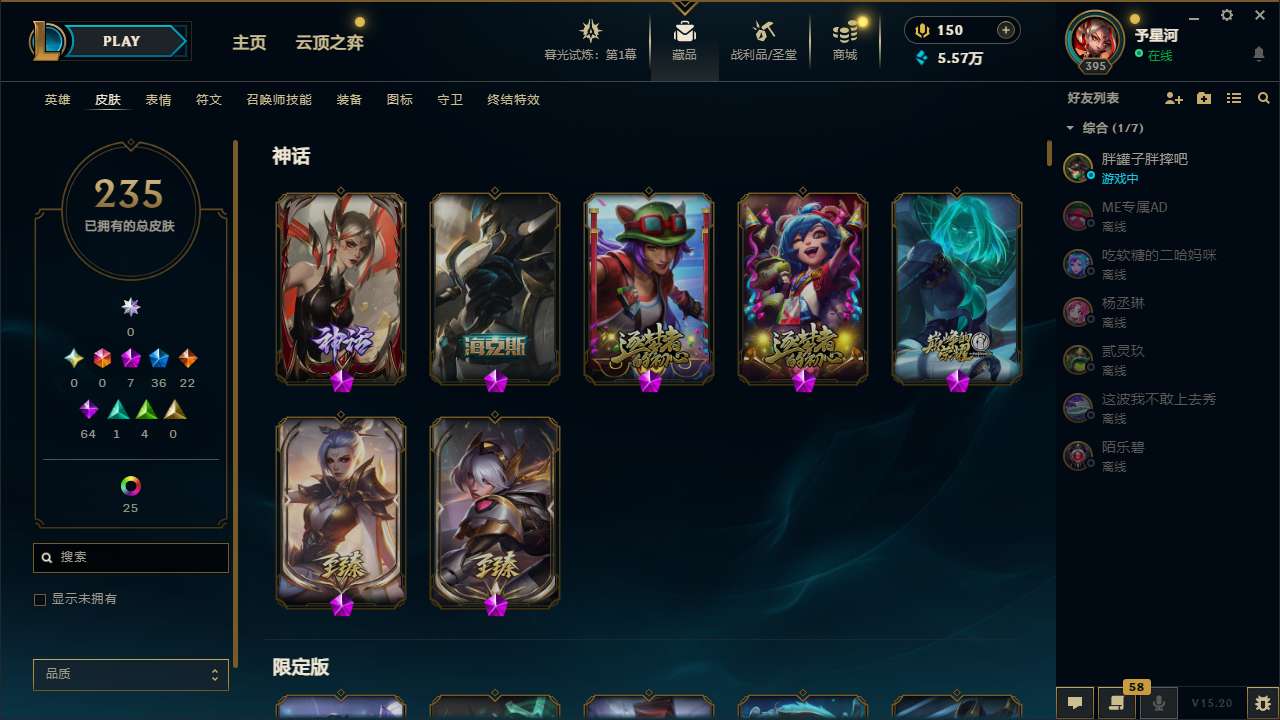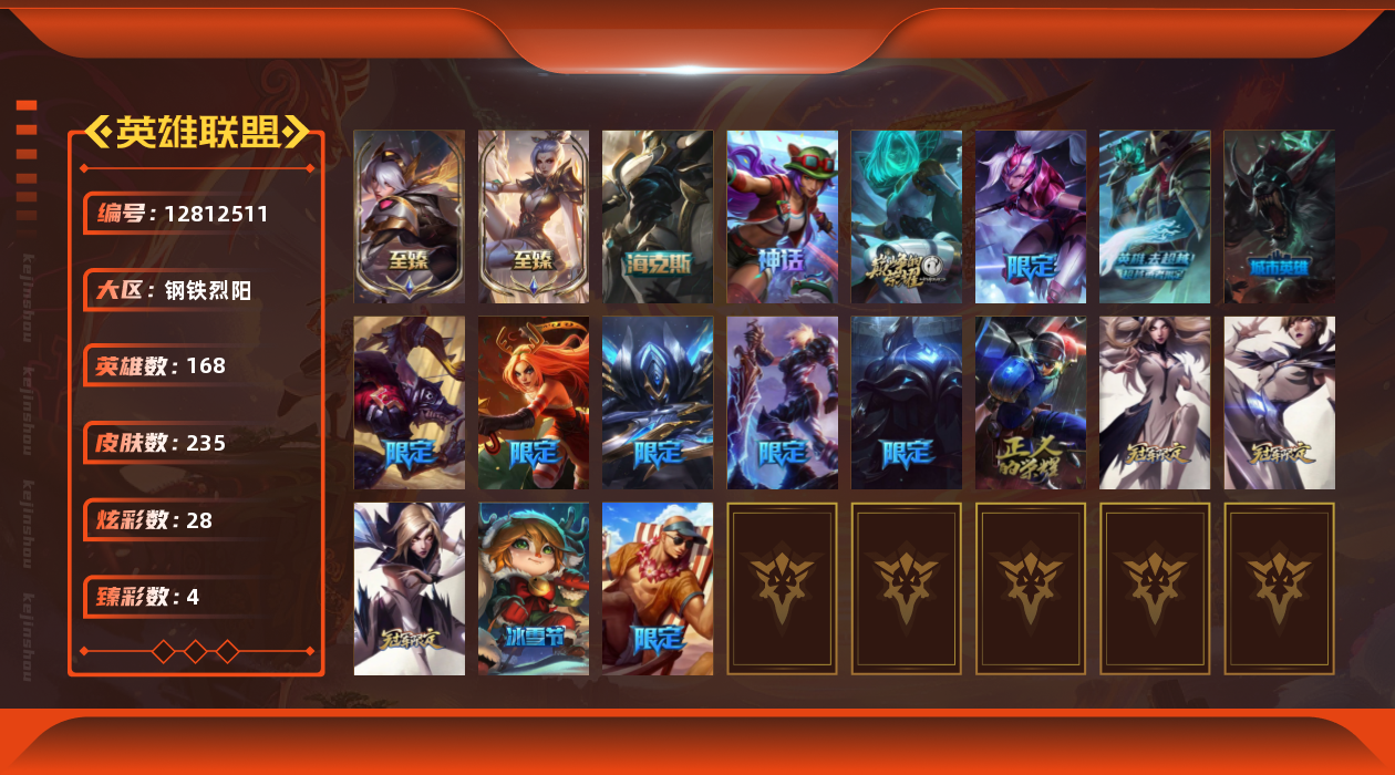 【11087059】[12812511]t28588【钢铁烈阳】235皮肤 28炫彩 4臻彩 7神话/36限定/22传说/168英雄 账号等级:395【重要头像】星守金克丝炫彩 【重要皮肤】源计划正义艾瑞莉娅至臻 玉剑传说武剑仙至臻 殿堂传奇乐芙兰 零之枪骑赫卡里姆 胜利剑圣易 胜利女神娑娜 胜利之树茂凯 胜利机器人布里茨 胜利女神奥莉安娜 胜利枪神格雷福斯 胜利枪神卢锡安