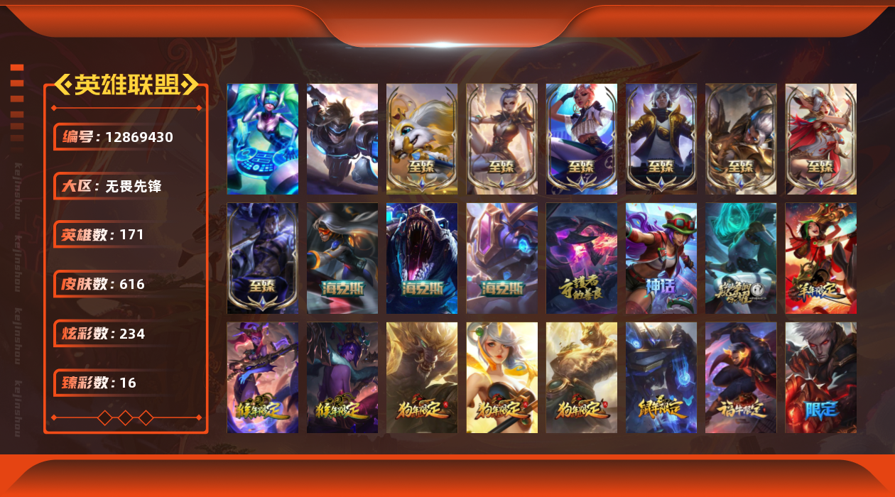 【11087095】[12869430]t28678【无畏先锋】616皮肤 234炫彩 16臻彩 17神话/92限定/58传说/171英雄 账号等级:569 云顶神话:1 单双排段位:黄金【重要头像】星守阿狸 爱意绵绵 心型钥匙 春晖神女拉克丝 救生圈 KDA萨勒芬妮 可爱悠米 【重要皮肤】墨之影武者亚索至臻 神凰行者烈羽焰凰霞至臻 真实伤害亚索至臻 神龙尊者炎龙瑟提至臻