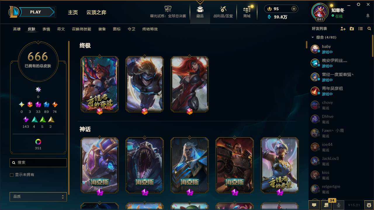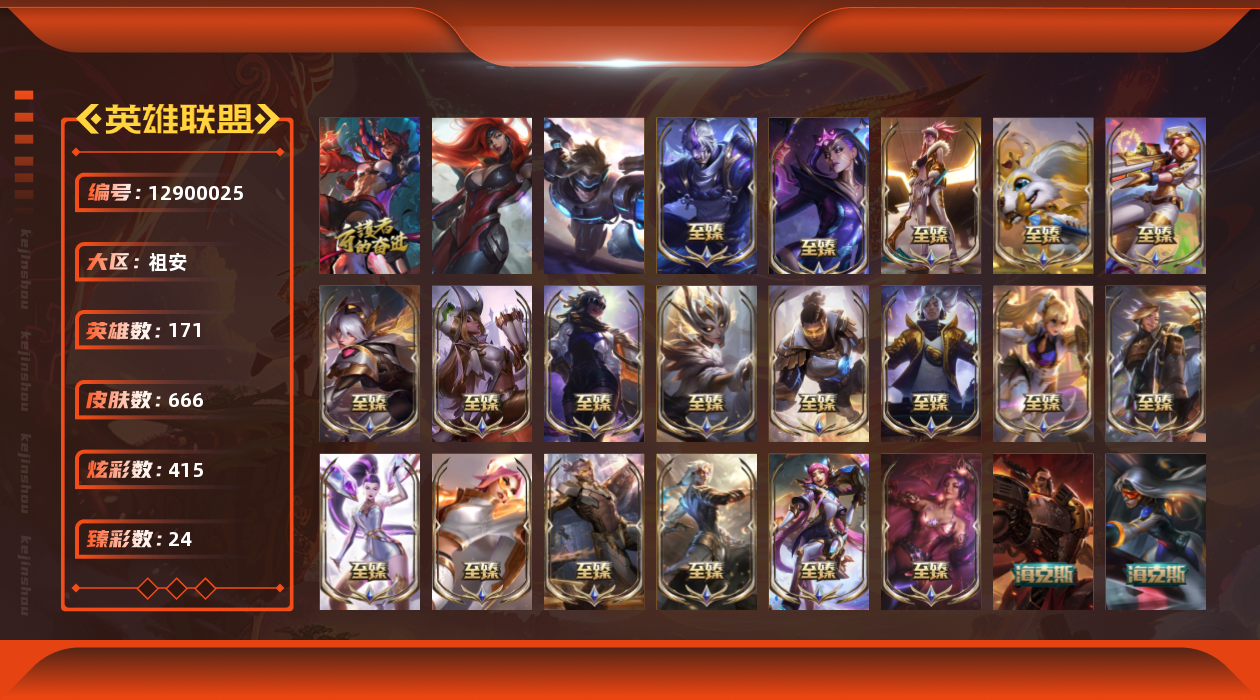 【11087199】[12900025]t28725【祖安】666皮肤 415炫彩 24臻彩 33神话/89限定/74传说/171英雄 账号等级:841 单双排段位:翡翠【重要头像】爱情之歌 觅心之翼奎因 我麦是开的么 魔女丽桑卓炫彩 KDA萨勒芬妮 小斗 星守卡莎 星守卡莎炫彩 幻灵战斗队长厄运小姐 幻灵战斗队长厄运小姐炫彩 魄罗宇航员 星守金克丝炫彩 灵魂莲华崔丝塔娜