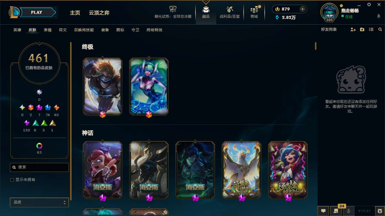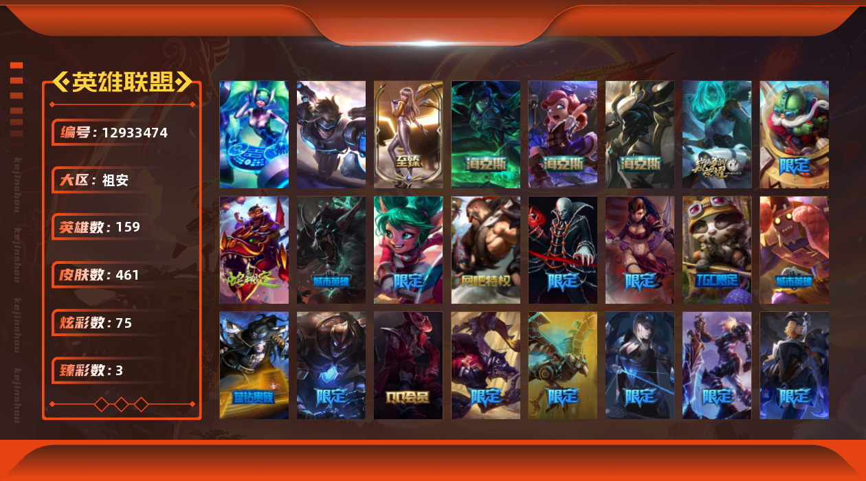 【11087262】[12933474]t28808【祖安】461皮肤 75炫彩 3臻彩 7神话/74限定/40传说/159英雄 账号等级:505 单双排段位:黄金【重要头像】喜庆红包 可爱悠米 【重要皮肤】KDA一代卡莎至臻 海克斯科技安妮 零之枪骑赫卡里姆 摄魂使者薇恩 胜利女神希维尔 钢铁军团拉克丝 安妮梦游仙境 电玩勇者锐雯 银龙裁决泰隆 古琴余韵娑娜 定海神珍孙