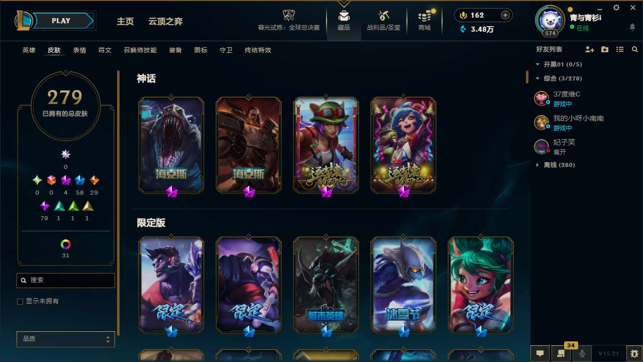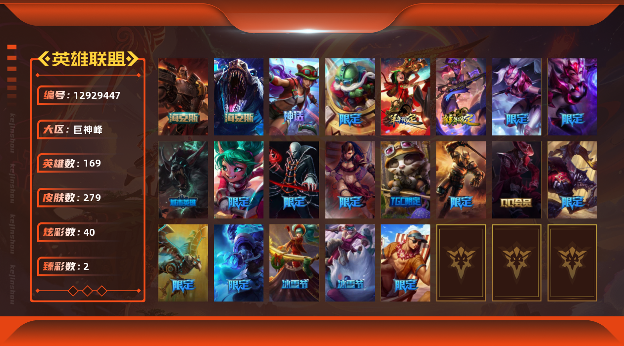 【11087336】[12929447]t28789【巨神峰】279皮肤 40炫彩 2臻彩 4神话/58限定/29传说/169英雄 账号等级:574 单双排段位:黄金【重要头像】银河魔装机神安妮 【重要皮肤】海克斯科技雷克顿 恐惧新星德莱厄斯 胜利剑圣易 胜利女神娑娜 胜利之王泰达米尔 胜利巨口克格莫 钢铁军团拉克丝 神龙烈焰金克丝 玉净夜叉凯特琳 胜利女神瑟庄妮 胜利机器