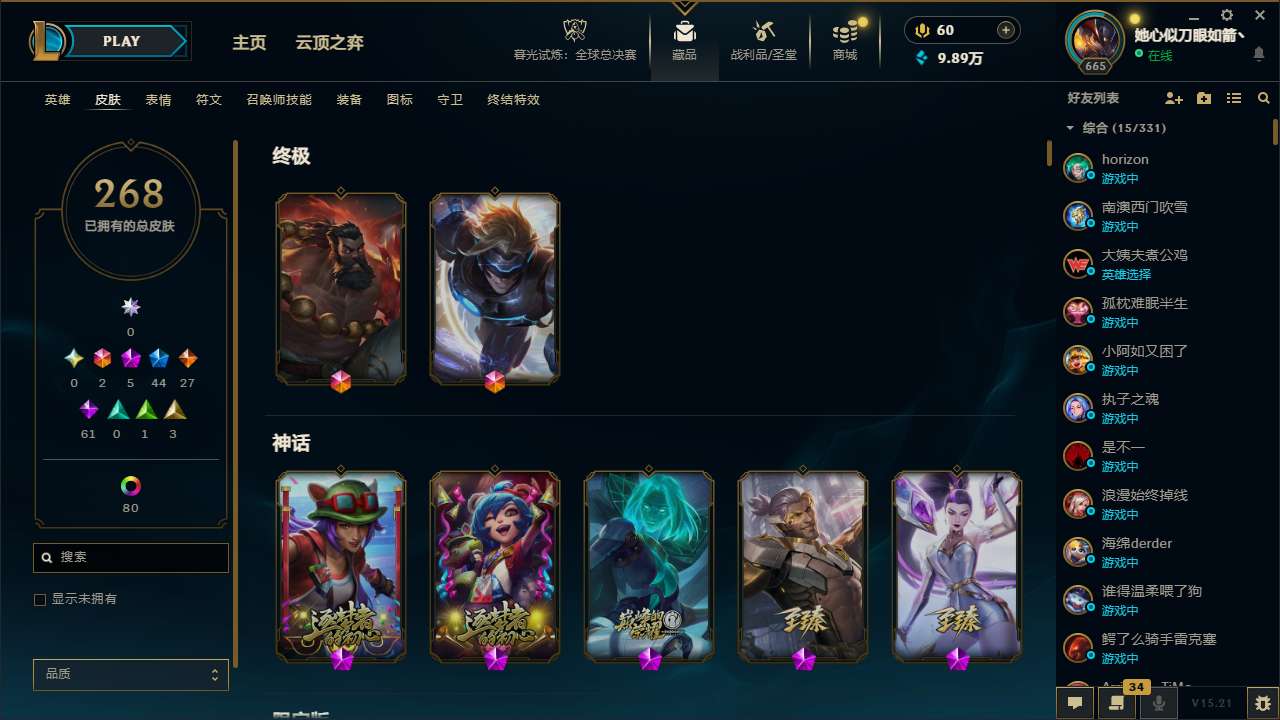 【11087350】[12973804]t28893【皮城警备】268皮肤 92炫彩 4臻彩 5神话/44限定/27传说/171英雄 账号等级:665 单双排段位:钻石【重要皮肤】源计划逆流塞拉斯至臻 KDA二代卡莎至臻 胜利剑圣易 胜利女神娑娜 胜利巨口克格莫 荣誉使者玛尔扎哈 点心宝贝阿木木 天龙之子斯莫德 胜利女神瑟庄妮 胜利机器人布里茨 胜利女神奥莉安娜 胜利之剑亚