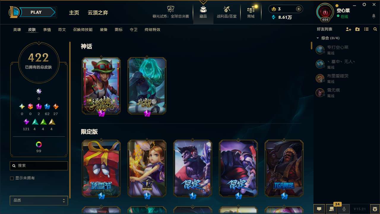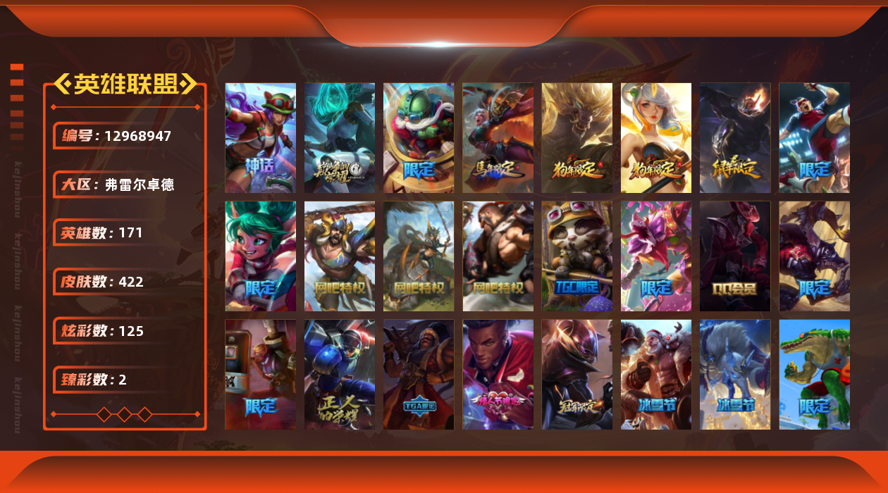 【11087427】[12968947]t28856【弗雷尔卓德】黑龙瞎 422皮肤 125炫彩 2臻彩 2神话/62限定/27传说/171英雄 账号等级:494 单双排段位:铂金【重要头像】心型钥匙 【重要皮肤】胜利巨口克格莫 创星之灵璐璐 奥斯曼大帝泰达米尔 安妮梦游仙境 电玩女神厄运小姐 玉剑传说无影 龙的传人李青 替父从军花木兰 春晖神女拉克丝 南天之怒沃里克 胜利