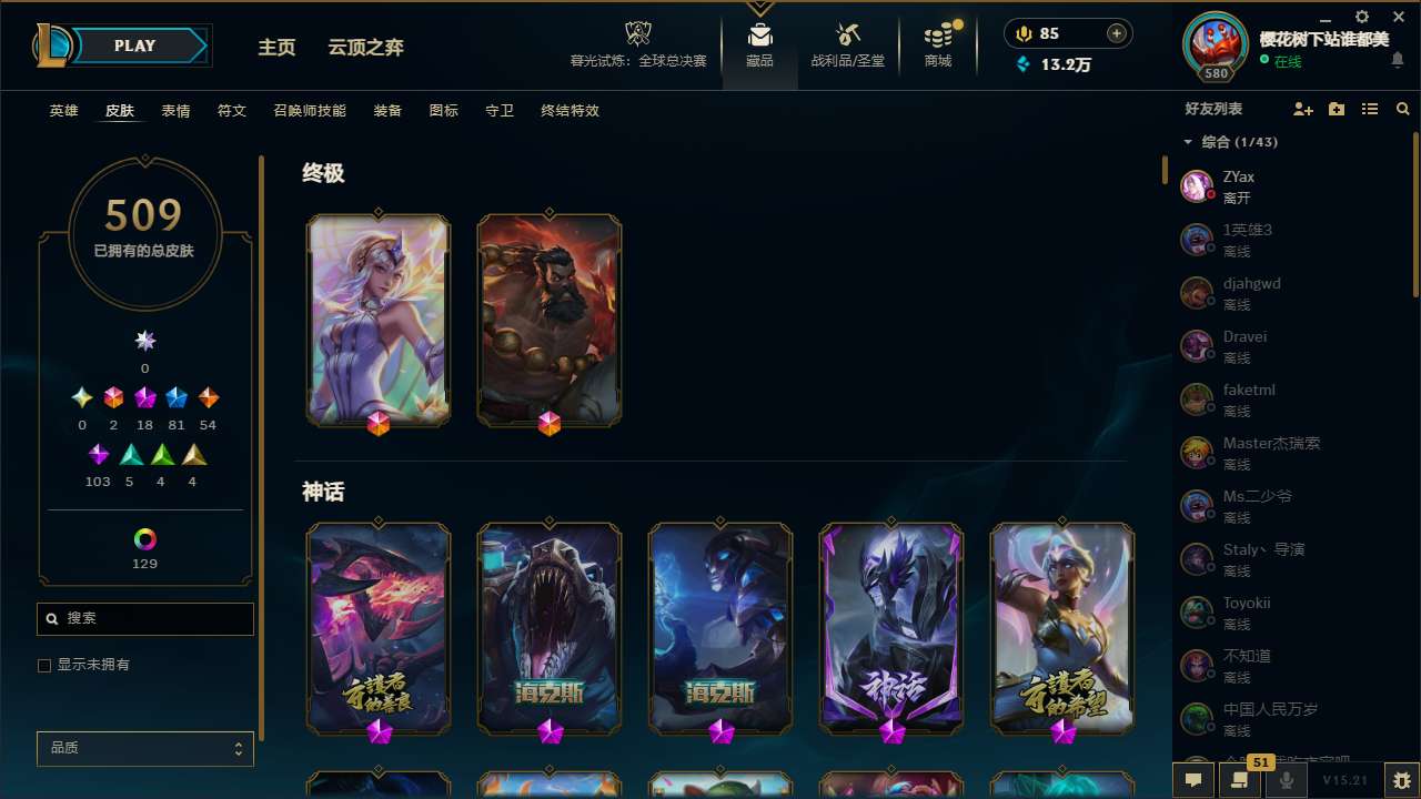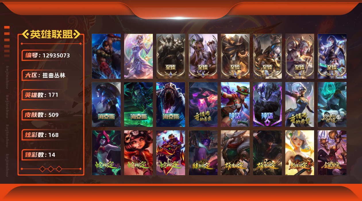 【11087429】[12935073]t28813【扭曲丛林】509皮肤 168炫彩 14臻彩 18神话/81限定/54传说/171英雄 账号等级:580【重要头像】爱意绵绵 雪花 此志无双羽饰骑士 不错哦 西部魔影卢锡安炫彩头 【重要皮肤】心之钢永恩至臻 女帝黛安娜至臻 神龙尊者炎龙瑟提至臻 魅惑女巫厄运小姐至臻 魅惑女巫厄运小姐2022至臻 腥红之月亚托克斯至臻 腥红