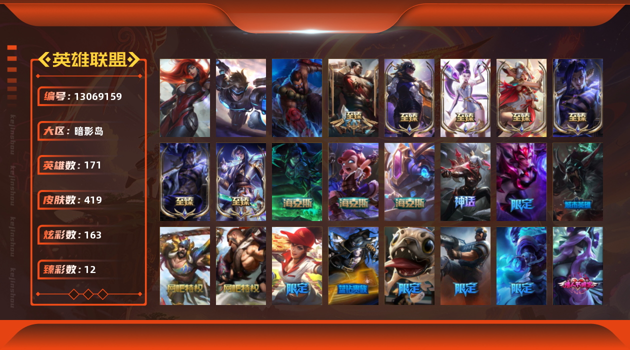 【11087476】[13069159]t29015【暗影岛】419皮肤 163炫彩 12臻彩 14神话/51限定/40传说/171英雄 账号等级:338 单双排段位:白银【重要头像】春晖神女拉克丝 救生圈 灵魂莲华厄斐琉斯 沐浴震惊 【重要皮肤】莲华温泉厄斐琉斯至臻 凯旋将军德莱厄斯至臻 心之钢永恩至臻 墨之影武者亚索至臻 至高天奎桑提至臻 神凰行者烈羽焰凰霞至臻 真实伤害