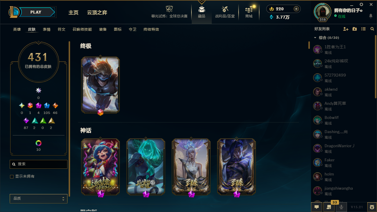 【11087516】[13044882]t29003【比尔吉沃特】431皮肤 28炫彩 8臻彩 4神话/105限定/46传说/162英雄 账号等级:316【重要头像】至爱的鹿 爱情之歌 心型钥匙 银河魔装机神安妮 万圣节卡特琳娜 幼犬内瑟斯 幼犬沃里克 披萨鸡 圣诞捣蛋鬼金克丝 至臻海珀利安小队迦娜 【重要皮肤】墨之影武者亚索至臻 海珀利安小队X09星环灵风迦娜至臻 电玩