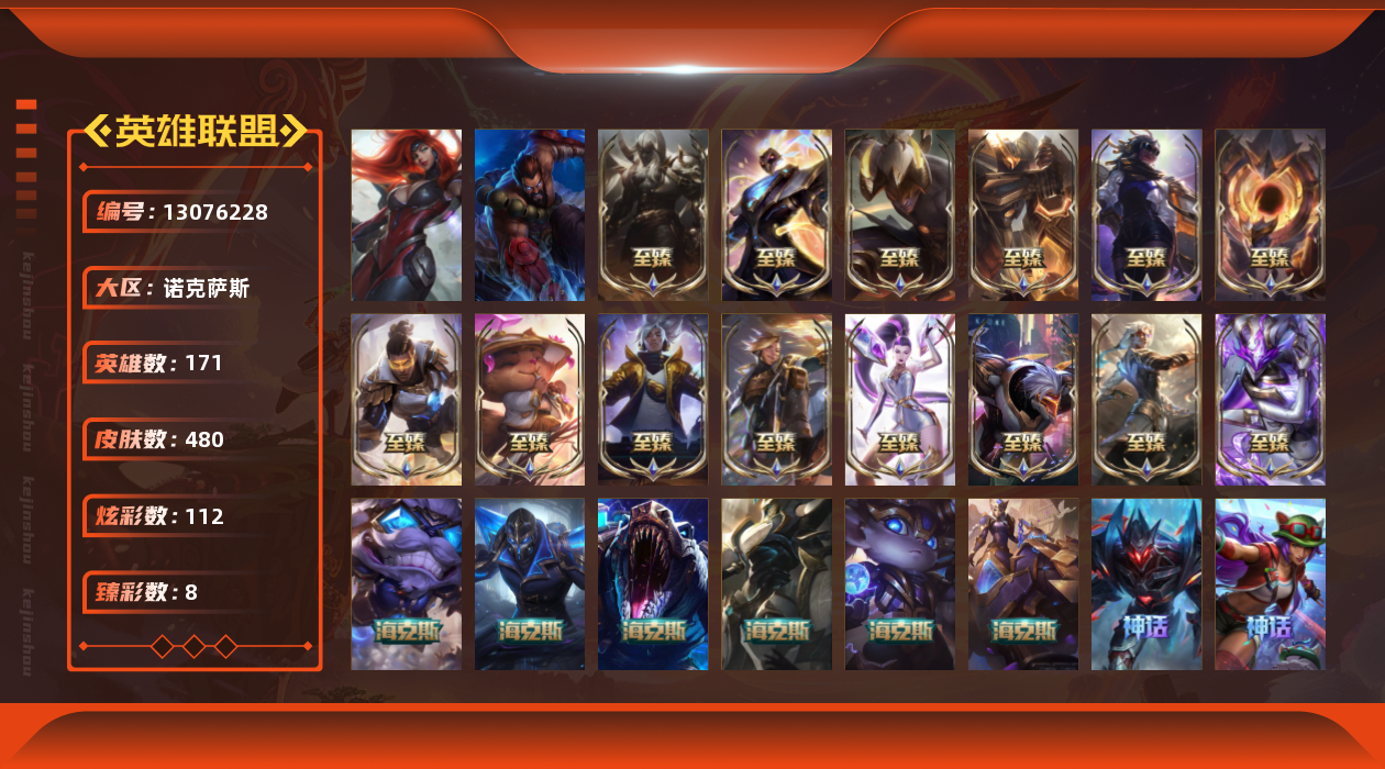 【11087531】[13076228]t29040【诺克萨斯】480皮肤 112炫彩 8臻彩 26神话/52限定/36传说/171英雄 账号等级:673【重要头像】觅心游侠卢锡安 青花瓷拉克丝炫彩 至臻KDA卡莎 至臻灵魂莲华提莫 【重要皮肤】机神玄武盖伦至臻 斗魂觉醒萨科至臻 未来战士卢锡安至臻 真实伤害亚索至臻 真实伤害赛娜至臻 灵魂莲华提莫至臻 灵能特工伊泽瑞尔至臻