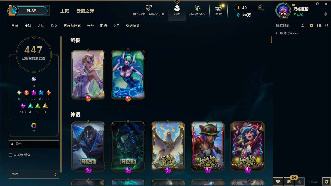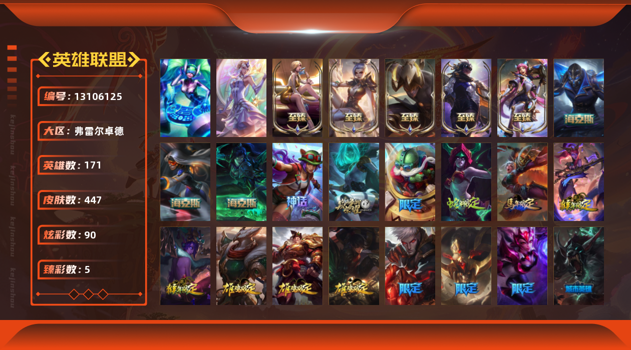【11087703】[13106125]t29101 皇冠账号【弗雷尔卓德】447皮肤 90炫彩 5臻彩 12神话/81限定/38传说/171英雄 账号等级:544 单双排段位:铂金【重要头像】心型钥匙 玉剑传说苍鸾边框 KDA萨勒芬妮 太空律动拉克丝 幼犬内瑟斯 沐浴震惊 女帝迦娜炫彩 征服者韦鲁斯炫金 【重要皮肤】幻灵战斗猫金克丝至臻 真实伤害赛娜至臻 KDA伊芙琳至臻