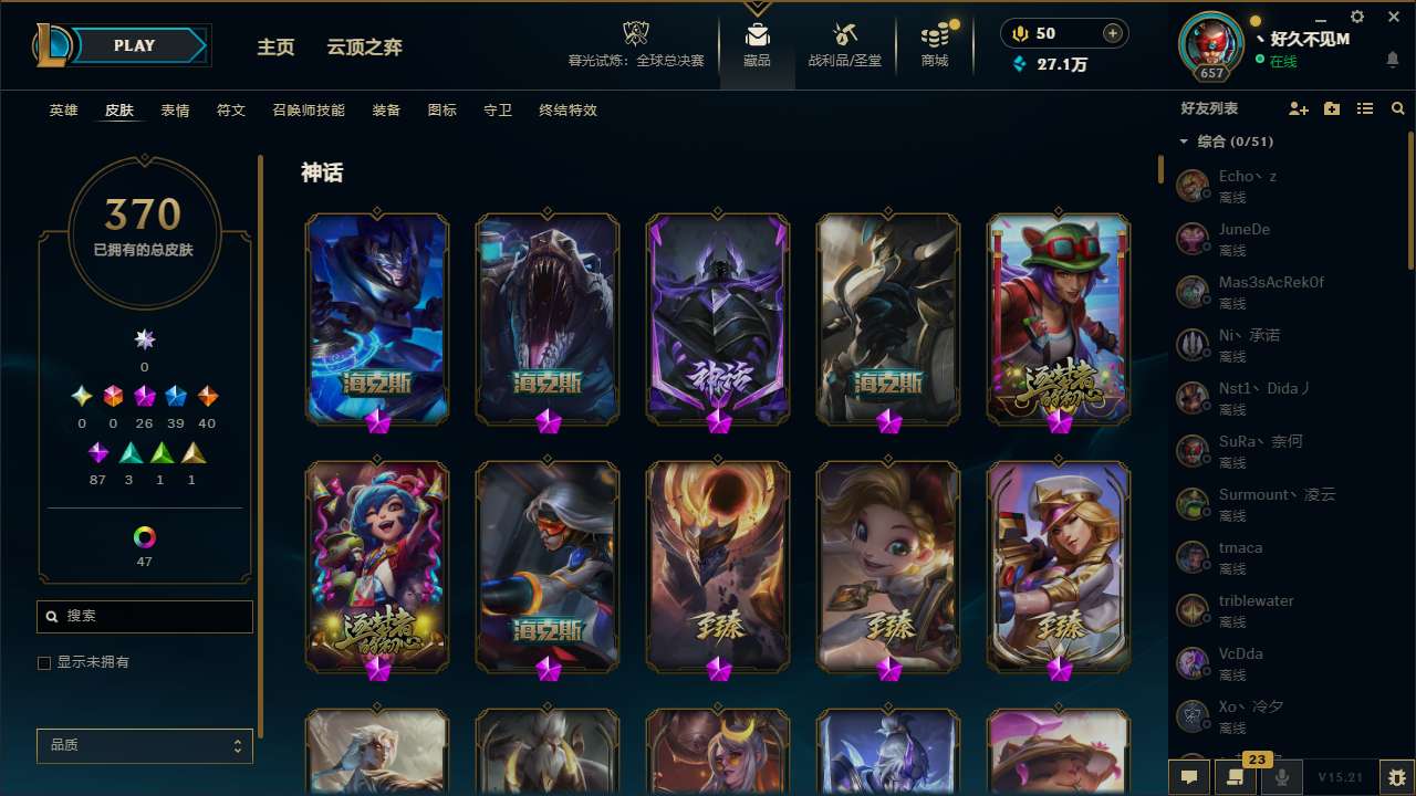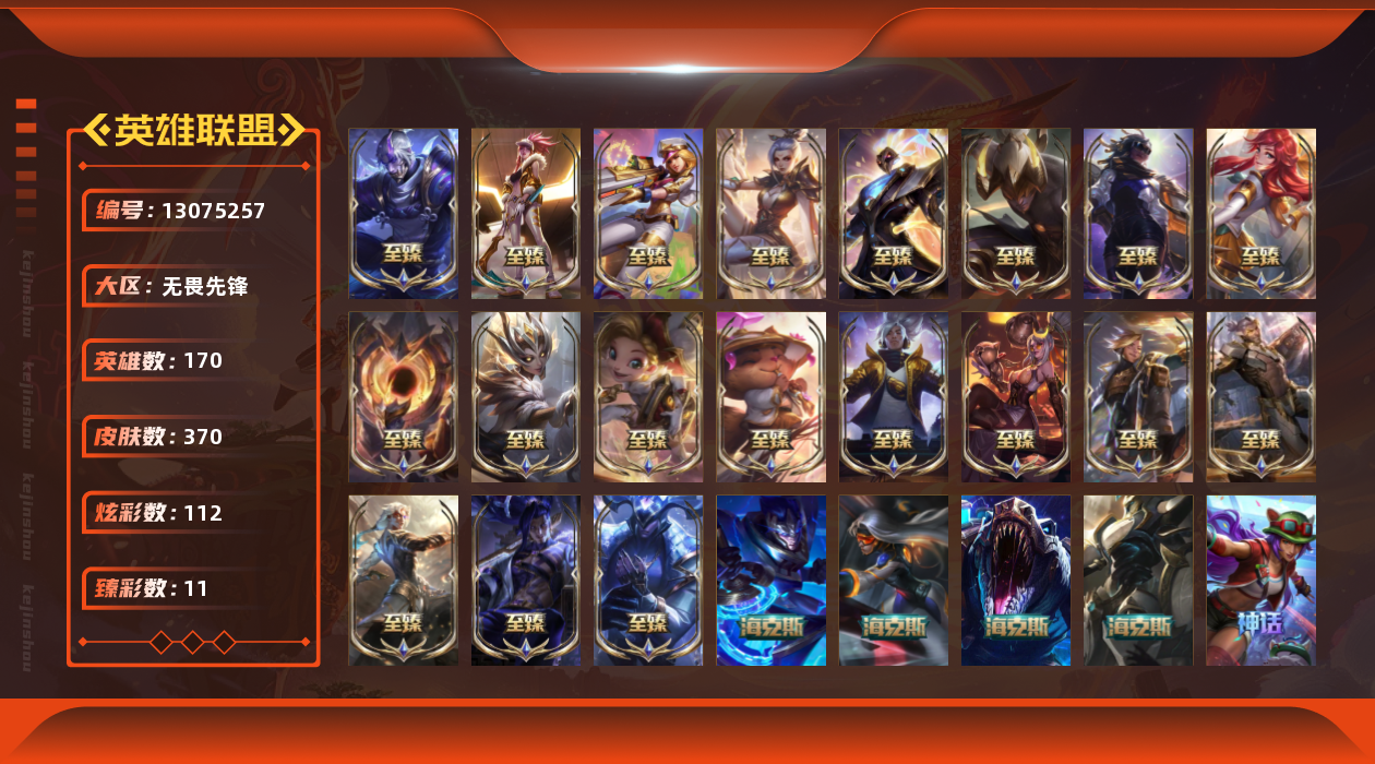 【11087729】[13075257]t29058【无畏先锋】370皮肤 112炫彩 11臻彩 26神话/39限定/40传说/170英雄 账号等级:657 单双排段位:铂金【重要头像】云顶古琴娑娜 我麦是开的么 此志无双羽饰骑士 圣诞捣蛋鬼金克丝 至臻魔女婕拉 【重要皮肤】灵魂莲华劫至臻 DRX亚托克斯至臻 墨之影武者亚索至臻 魔女婕拉至臻 奥术师佐伊至臻 真实伤害亚索至臻