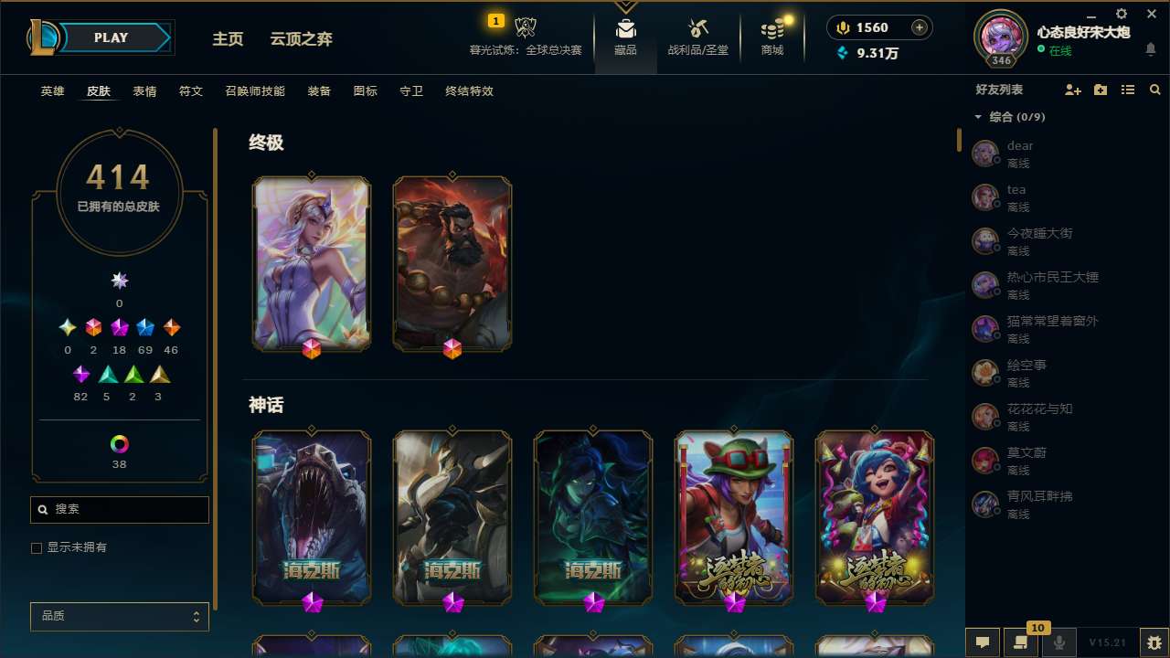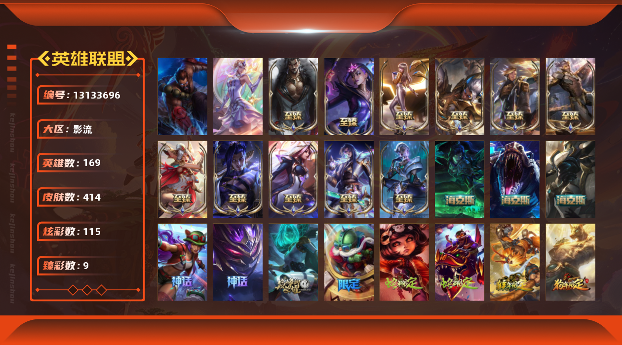 【11087738】[13133696]t29137【影流】414皮肤 115炫彩 9臻彩 18神话/69限定/46传说/169英雄 账号等级:346【重要头像】银河魔装机神安妮 击拳 幼犬内瑟斯 【重要皮肤】狼神英灵斯维因至臻 暗星女王黛安娜至臻 北极星钢影卡蜜尔至臻 心之钢永恩至臻 绝息圣堂厄运小姐至臻 至高天奎桑提至臻 神凰行者烈羽焰凰霞至臻 灵能特工伊泽瑞尔至臻 源
