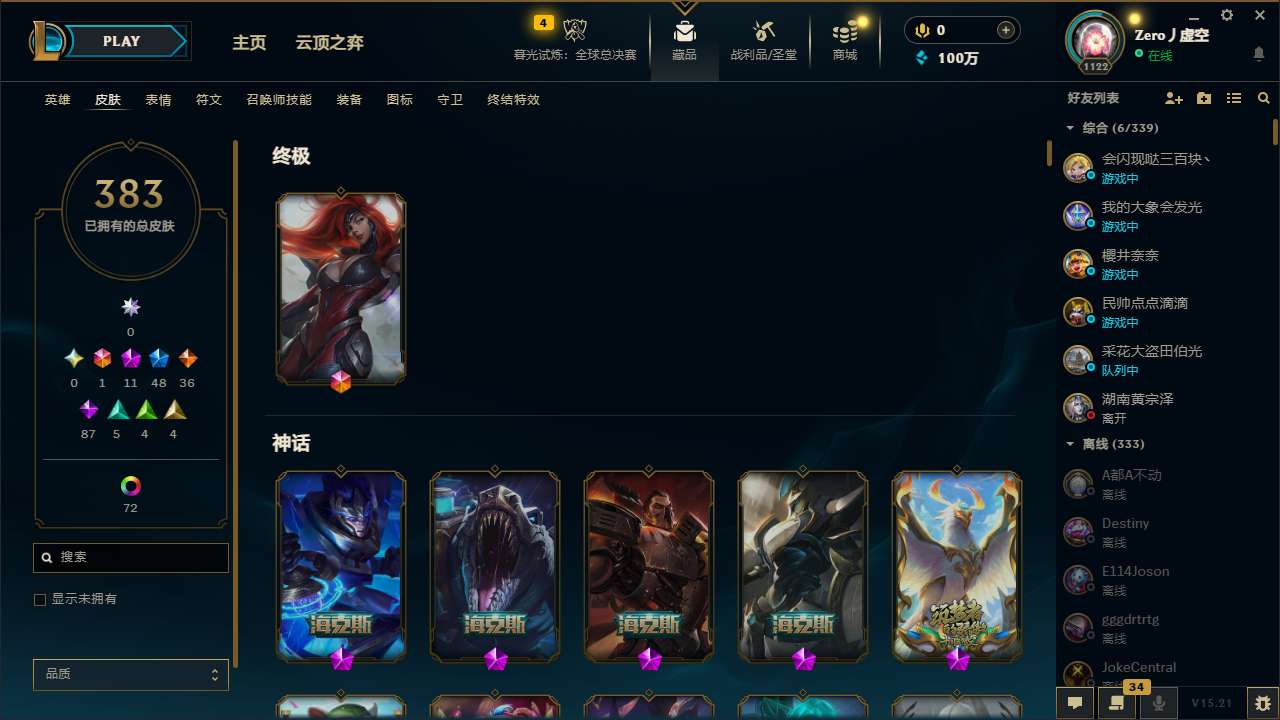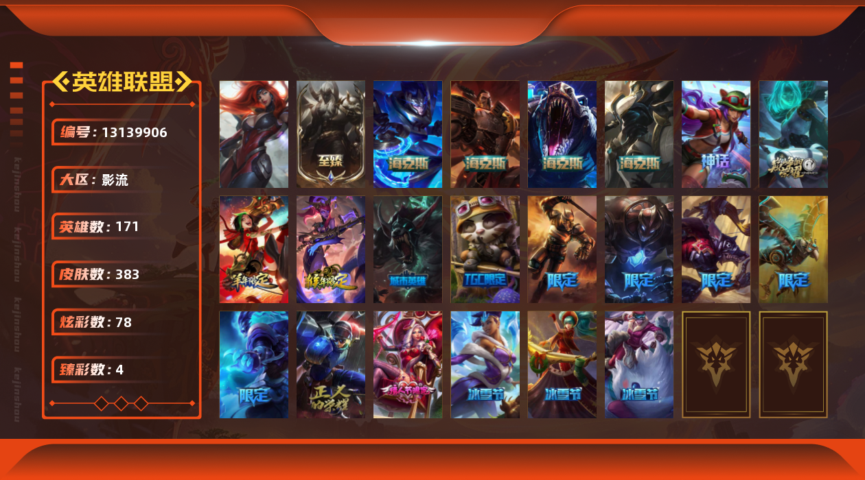 【11087780】[13139906]t29162【影流】383皮肤 78炫彩 4臻彩 11神话/48限定/36传说/171英雄 账号等级:1122 单双排段位:铂金【重要头像】幼犬沃里克 【重要皮肤】腥红之月亚托克斯至臻 腥红之月亚托克斯2022至臻 海克斯科技雷克顿 海克斯科技嘉文四世 水晶掠夺者卡兹克 恐惧新星德莱厄斯 零之枪骑赫卡里姆 胜利剑圣易 胜利女神娑娜 胜利