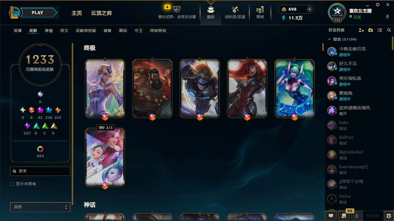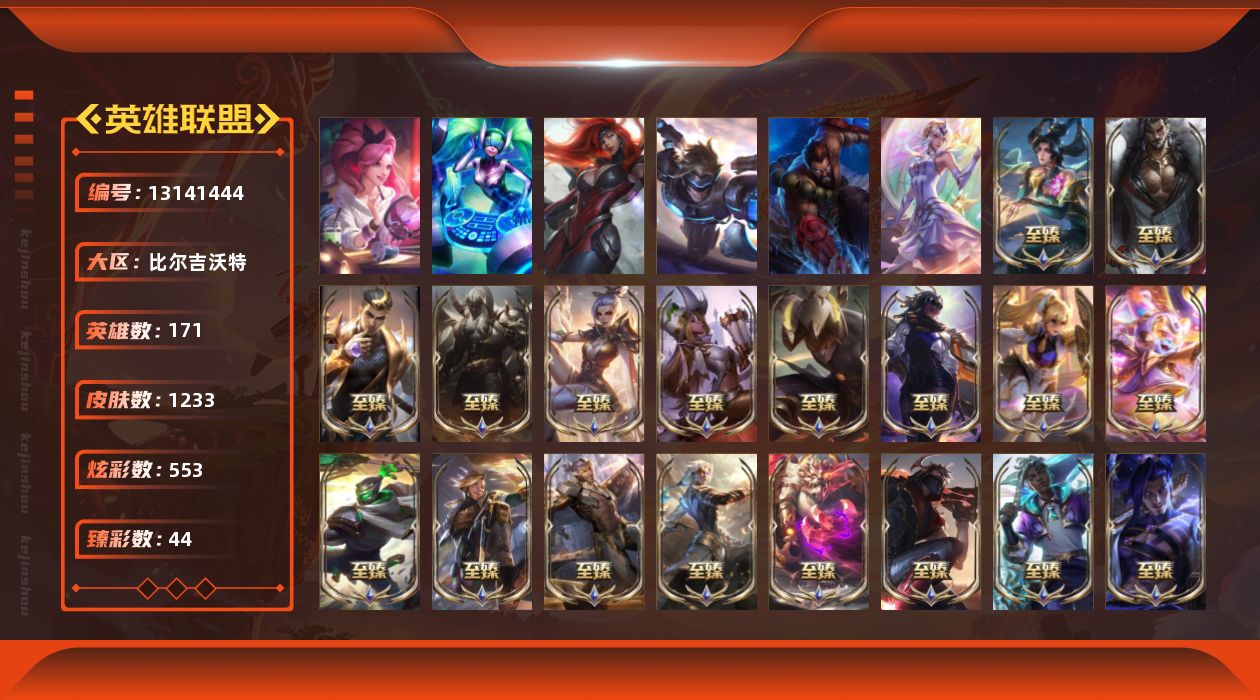 【11087800】[13141444]t29172 皇冠账号【比尔吉沃特】原皮龙瞎 1233皮肤 553炫彩 44臻彩 42神话/236限定/103传说/171英雄 账号等级:735 单双排段位:铂金【重要头像】星守阿狸 云顶星守阿卡丽 心型钥匙 觅心游侠卢锡安 觅心之翼奎因 两仪无极 萨勒芬妮超级巨星 萨勒芬妮独立音乐人 万圣节卡特琳娜 KDA卡莎BAEST KDA萨勒芬