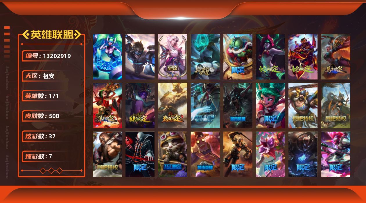 【11087818】[13202919]t29301【祖安】 508皮肤 37炫彩 7臻彩 2神话/81限定/38传说/171英雄 账号等级:371 单双排段位:翡翠【重要头像】雪花 小茹 【重要皮肤】灵魂莲华拉克丝至臻 电玩女神厄运小姐 电玩勇者锐雯 星之守护者伊泽瑞尔 玉剑传说无影 玉剑传说舞剑仙 替父从军花木兰 神龙烈焰金克丝 碧玉之牙卡西奥佩娅 古琴余韵娑娜 北辰