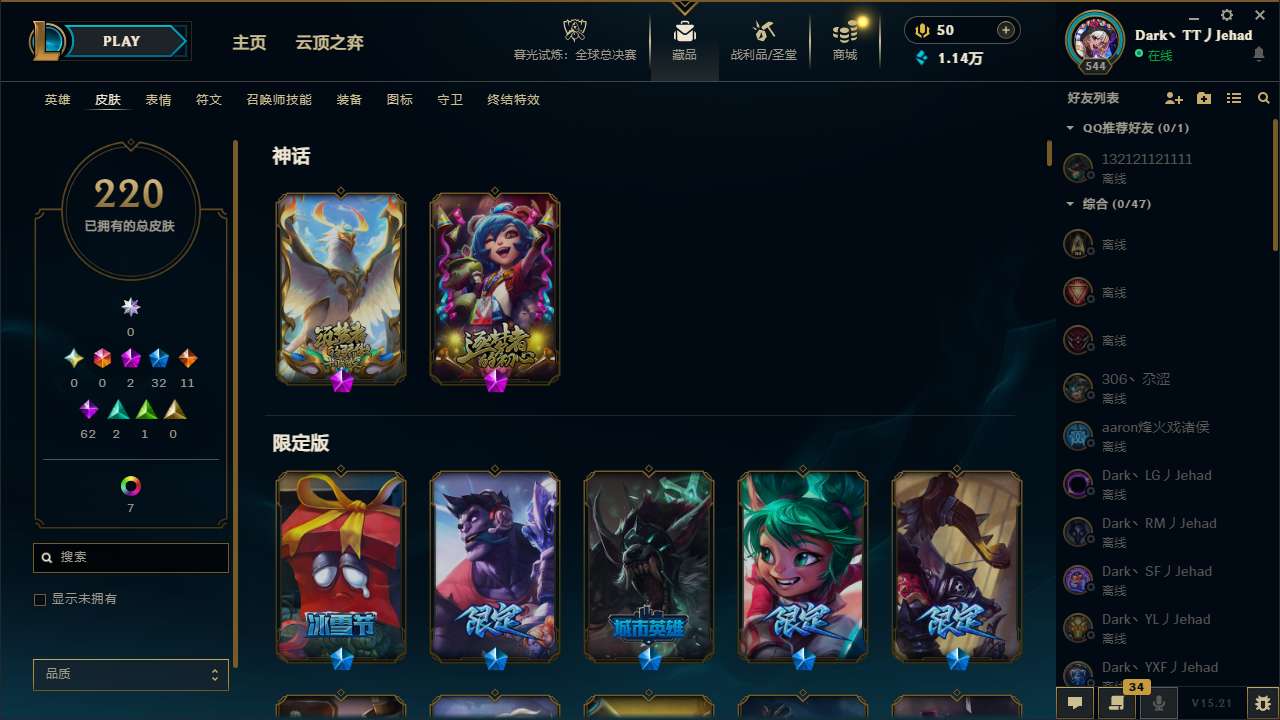 【11087836】[13109597]t29118【皮尔特沃夫】220皮肤 9炫彩 2神话/32限定/11传说/168英雄 账号等级:544【重要皮肤】胜利女神希维尔 胜利之王泰达米尔 神龙之翼库奇 胜利之树茂凯 胜利机器人布里茨 胜利女神奥莉安娜 胜利枪神格雷福斯 胜利枪神卢锡安 胜利之剑亚托克斯 平安夜女神娑娜 SKTT1雷克顿 SKTT1劫 SKTT1李青 暗杀