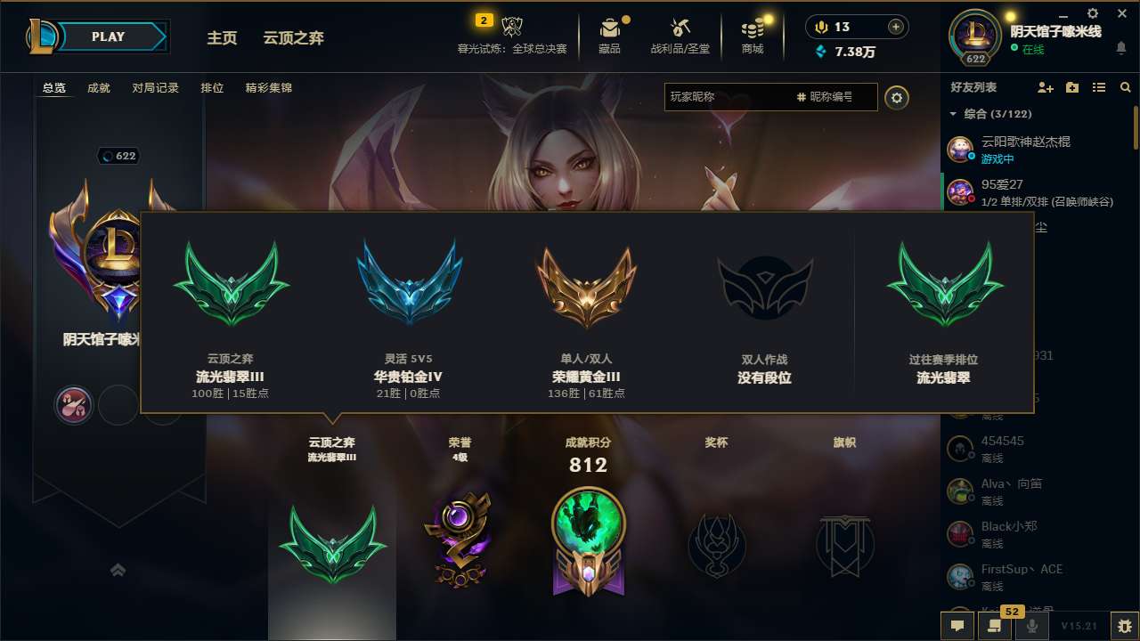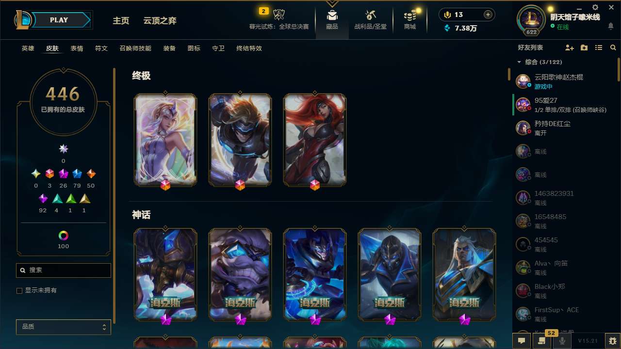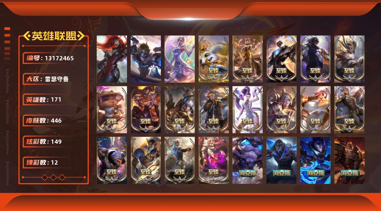 【11087875】[13172465]t29246【雷瑟守备】446皮肤 149炫彩 12臻彩 26神话/79限定/50传说/171英雄 账号等级:622 云顶神话:1 单双排段位:黄金【重要头像】御星魔矢艾希 周年女刀图标 我麦是开的么 泳池派对凯特琳 KDA阿狸 KDA阿狸炫彩 真实伤害阿卡丽 至臻福牛守护者菲奥娜 至臻女帝黛安娜 至臻KDA卡莎 至臻灵魂莲华提莫 【