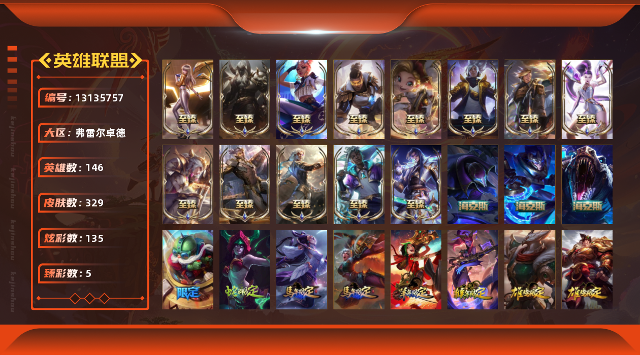 【11087884】[13135757]t29145【弗雷尔卓德】329皮肤 135炫彩 5臻彩 19神话/62限定/35传说/146英雄 账号等级:440 单双排段位:铂金【重要头像】心型钥匙 我麦是开的么 救生圈 KDA阿卡丽 KDA阿卡丽炫彩 KDA萨勒芬妮 女帝卡特琳娜炫彩 烈焰美人薇恩炫彩 真实伤害艾克 至臻KDA卡莎 至臻奥术师佐伊 【重要皮肤】心之钢永恩至臻