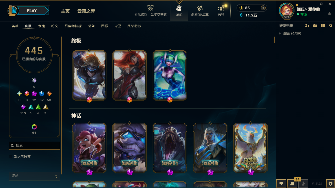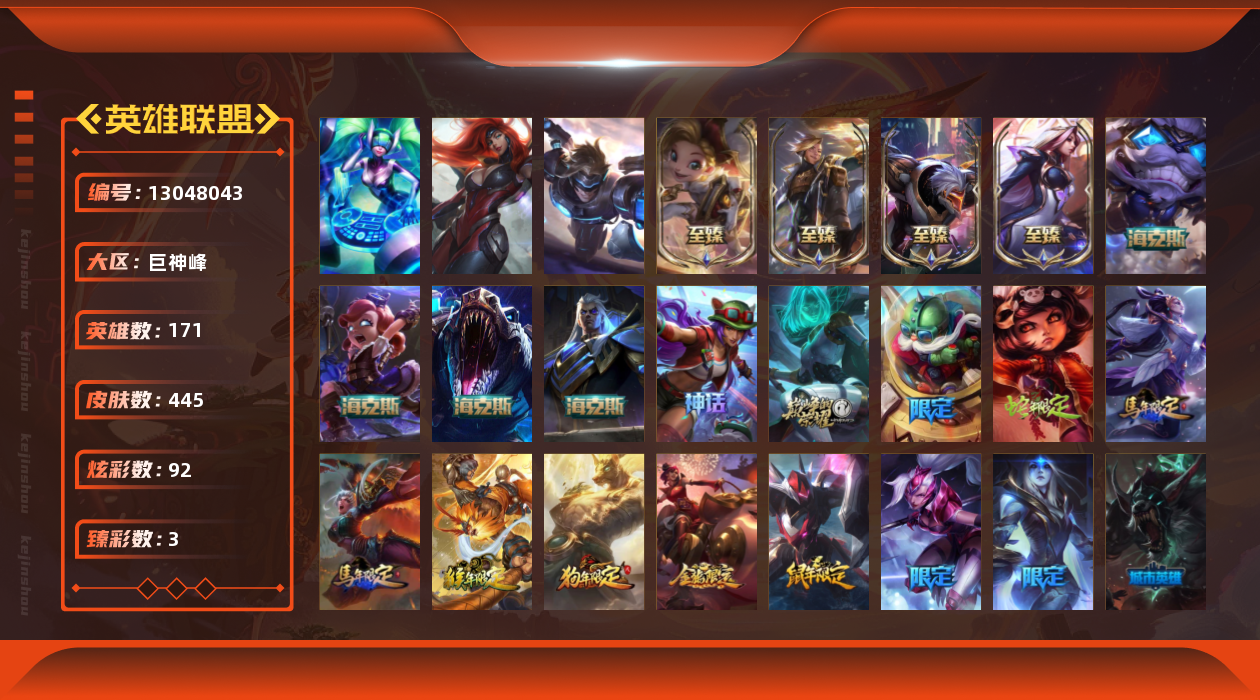 【11087889】[13048043]t28999【巨神峰】445皮肤 92炫彩 3臻彩 12神话/62限定/58传说/171英雄 账号等级:574【重要头像】觅心游侠卢锡安 勇者阿狸炫金 KDA萨勒芬妮 可爱安妮 至臻奥术师佐伊 【重要皮肤】绝息圣堂厄运小姐至臻 奥术师佐伊至臻 灵能特工伊泽瑞尔至臻 源计划阴劫至臻 海克斯科技安妮 海克斯科技雷克顿 海克斯科技斯维因