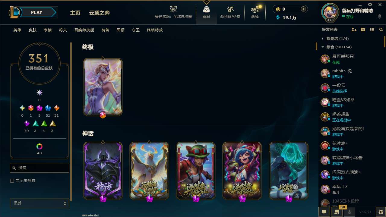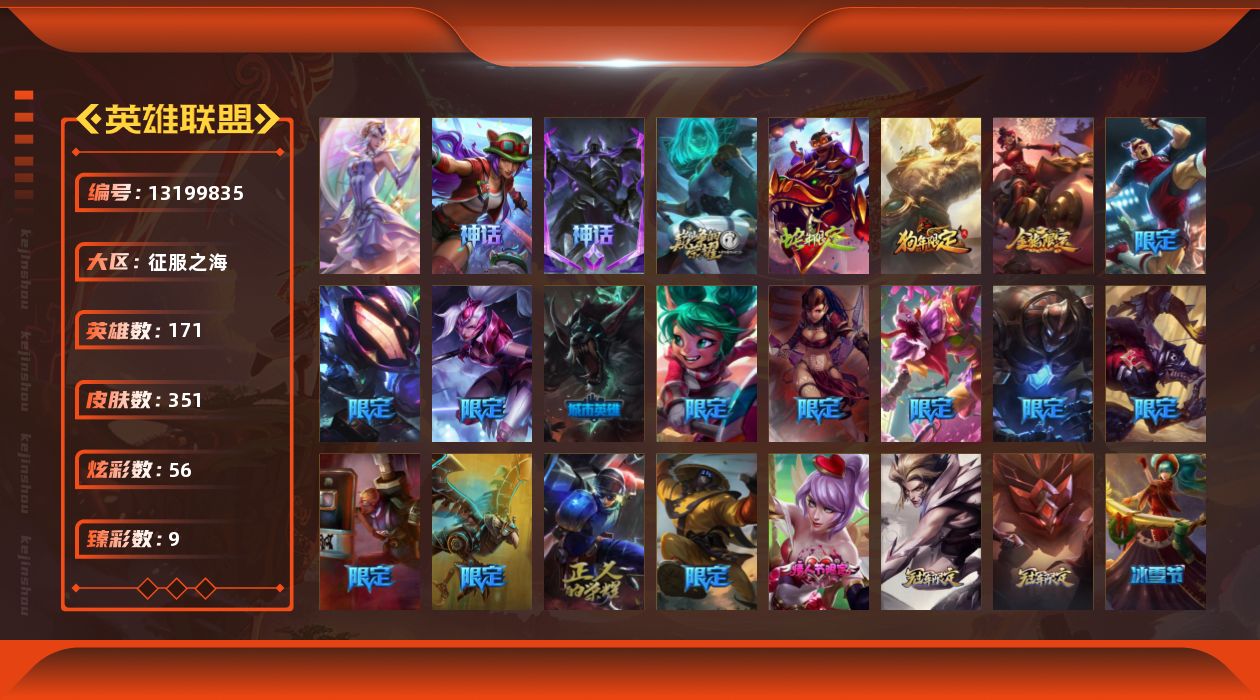 【11087916】[13199835]t29274【征服之海】351皮肤 56炫彩 9臻彩 5神话/51限定/31传说/171英雄 账号等级:478 单双排段位:翡翠【重要头像】觅心游侠卢锡安 觅心之翼奎因 银河魔装机神安妮 神龙尊者艾希 救生圈 小望与小牙 美猴王孙悟空 【重要皮肤】灰烬骑士莫德凯撒 胜利剑圣易 玉剑传说舞剑仙 灵能特工易 北辰之威内瑟斯 金猪烈焰瑟庄