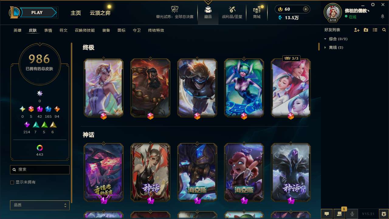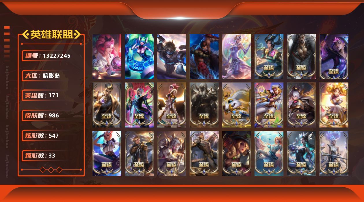 【11088000】[13227245]t29297 皇冠账号【暗影岛】黑龙瞎 986皮肤 547炫彩 33臻彩 42神话/165限定/94传说/171英雄 账号等级:618 云顶神话:3 【重要头像】女巫头 锦鲤娜美 云顶战斗学院伊泽瑞尔 云顶星守阿卡丽 爱意绵绵 爱情之歌 心型钥匙 觅心游侠卢锡安 雪花 银河魔装机神安妮 萨勒芬妮超级巨星 萨勒芬妮独立音乐人 卡特琳娜的匕首 万圣节卡特琳娜