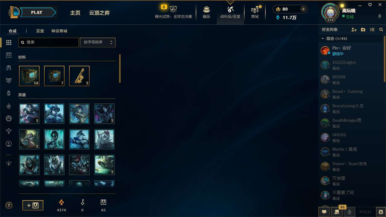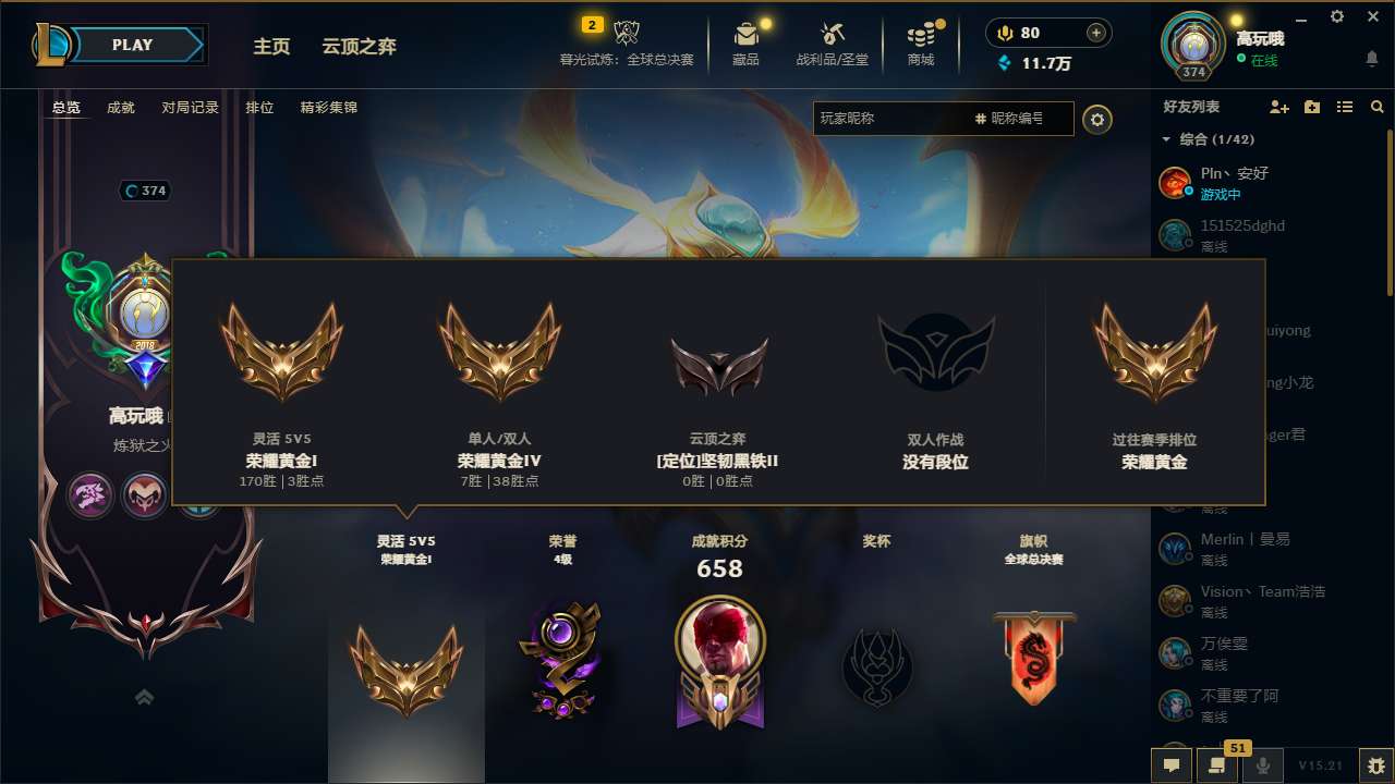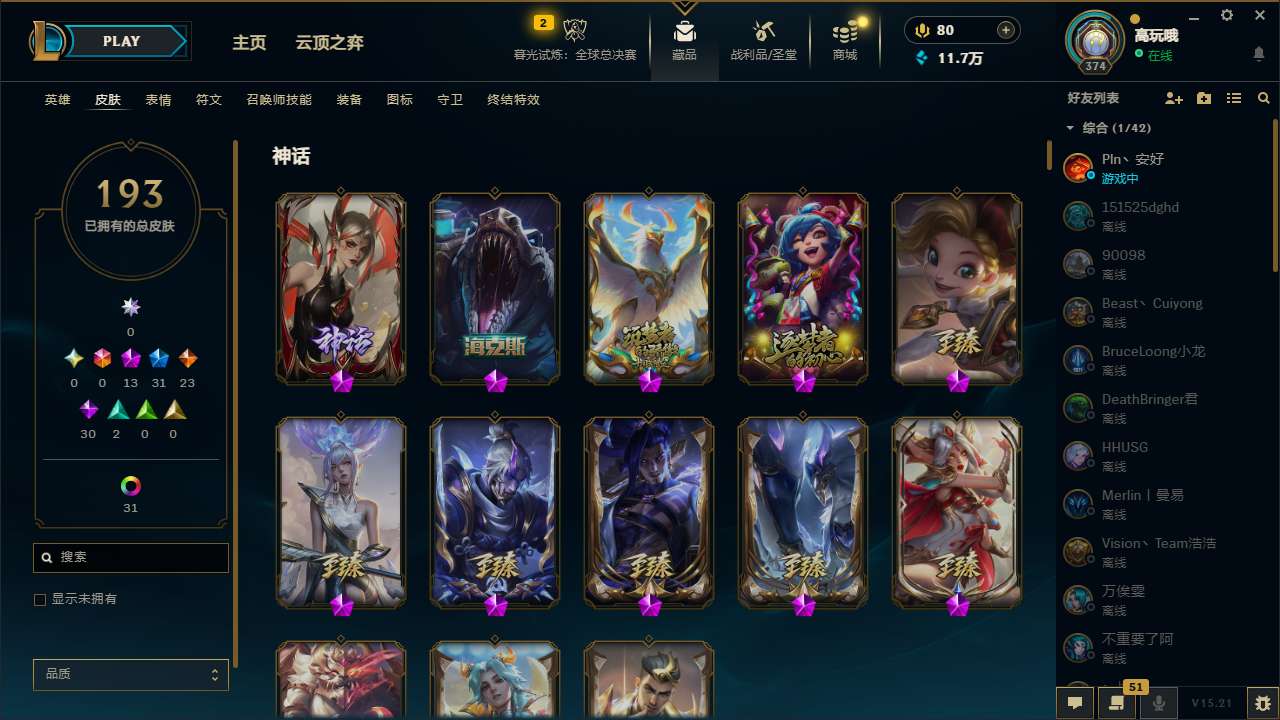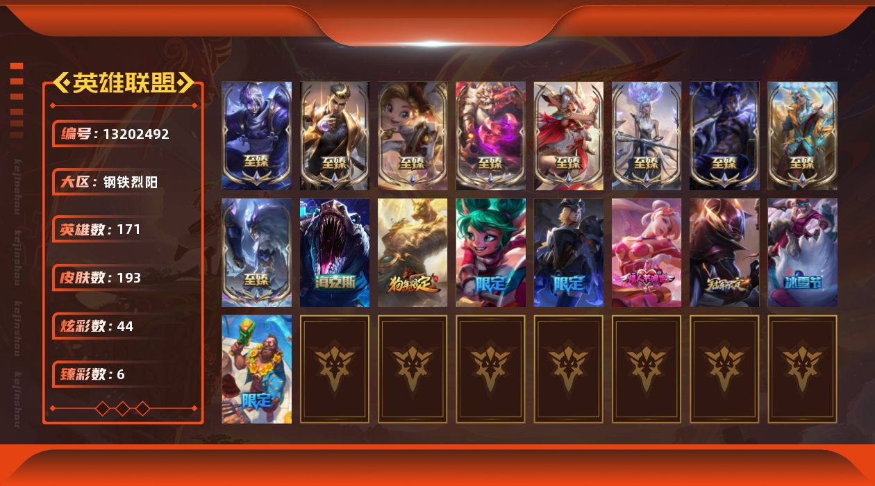 【11088116】[13202492]t29298【钢铁烈阳】 193皮肤 44炫彩 6臻彩 13神话/31限定/23传说/171英雄 账号等级:374 单双排段位:黄金【重要头像】救生圈 至臻神凰行者霞 【重要皮肤】灵魂莲华劫至臻 T1杰斯至臻 青花瓷千珏至臻 天龙之子伊泽瑞尔至臻 墨之影武者亚索至臻 海珀利安小队X09星环灵风迦娜至臻 神凰行者烈羽焰凰霞至臻 奥术师佐伊至