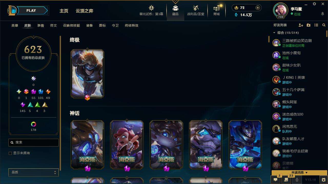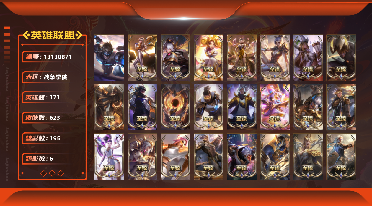 【11088208】[13130871]t27023【战争学院】 623皮肤 195炫彩 6臻彩 55神话/101限定/49传说/171英雄 账号等级:708 单双排段位:铂金 【重要头像】FPX冠军手办 爱情之歌 KDA萨勒芬妮 小斗 EDG厄斐琉斯 EDG佛耶戈 EDG格雷福斯 EDG悠米 EDG佐伊 太空律动莎弥拉 太空律动莎弥拉炫彩 可爱悠米 可爱安妮 福牛守护者厄斐琉斯炫彩 福牛守护者