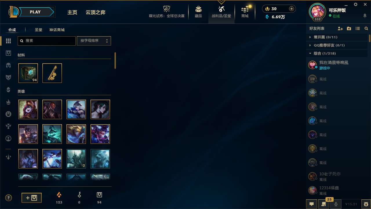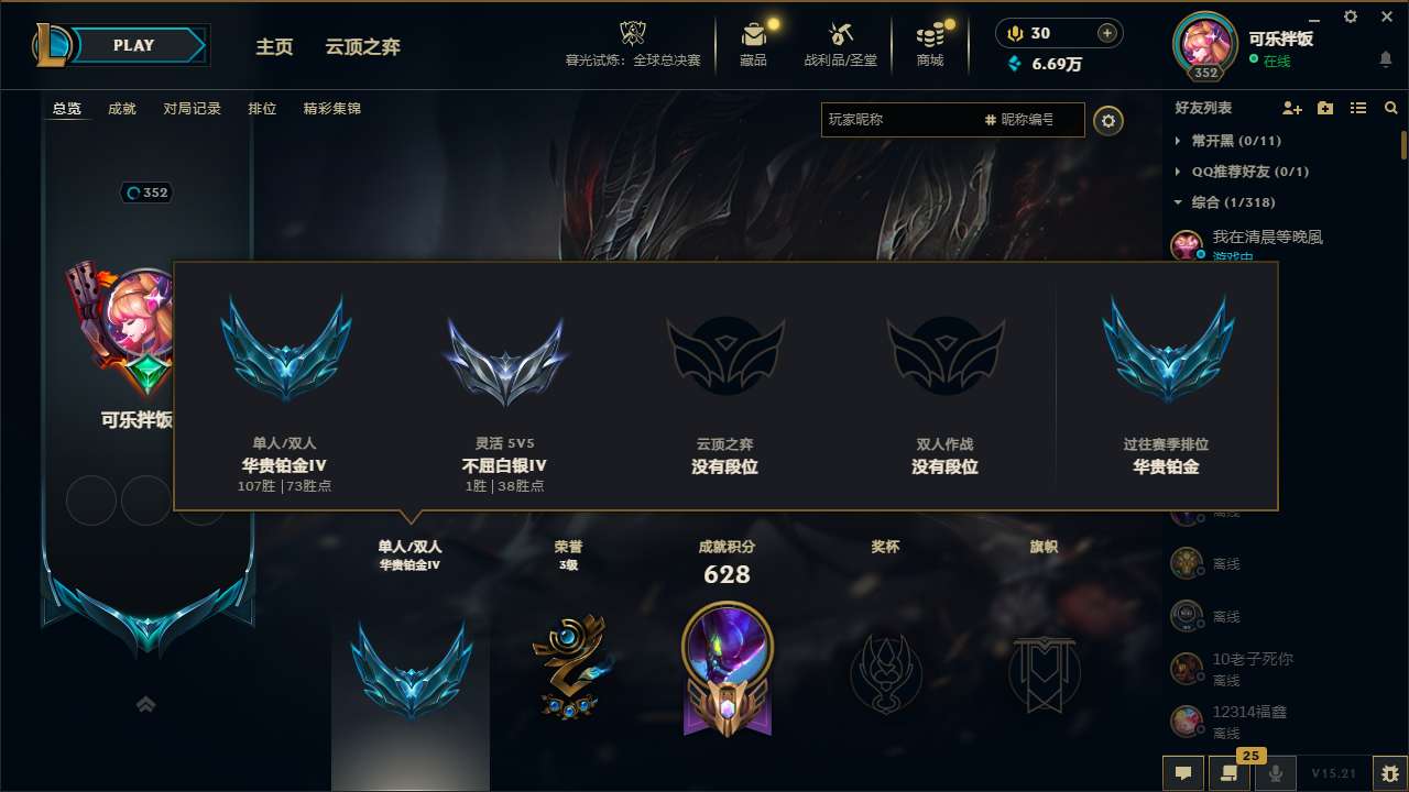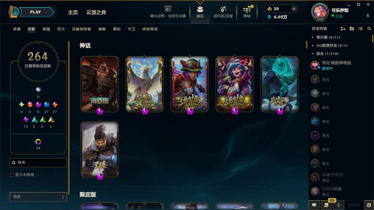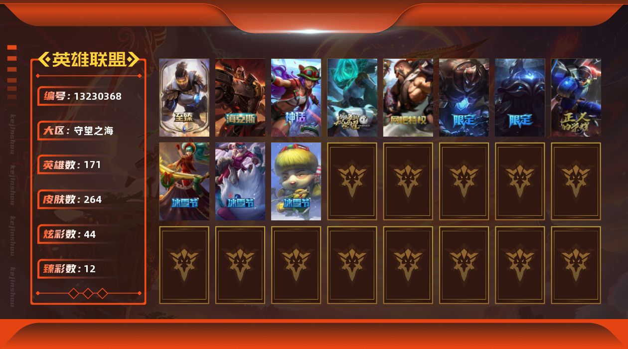 【11088348】[13230368]t29340【守望之海】264皮肤 44炫彩 12臻彩 6神话/27限定/27传说/171英雄 账号等级:352 单双排段位:铂金【重要头像】星守阿狸 星守金克丝炫彩 【重要皮肤】未来战士卢锡安至臻 恐惧新星德莱厄斯 胜利剑圣易 胜利女神娑娜 胜利之王泰达米尔 胜利巨口克格莫 胜利机器人布里茨 雪球也能爆炸吉格斯 魄罗骑士瑟庄妮 平安