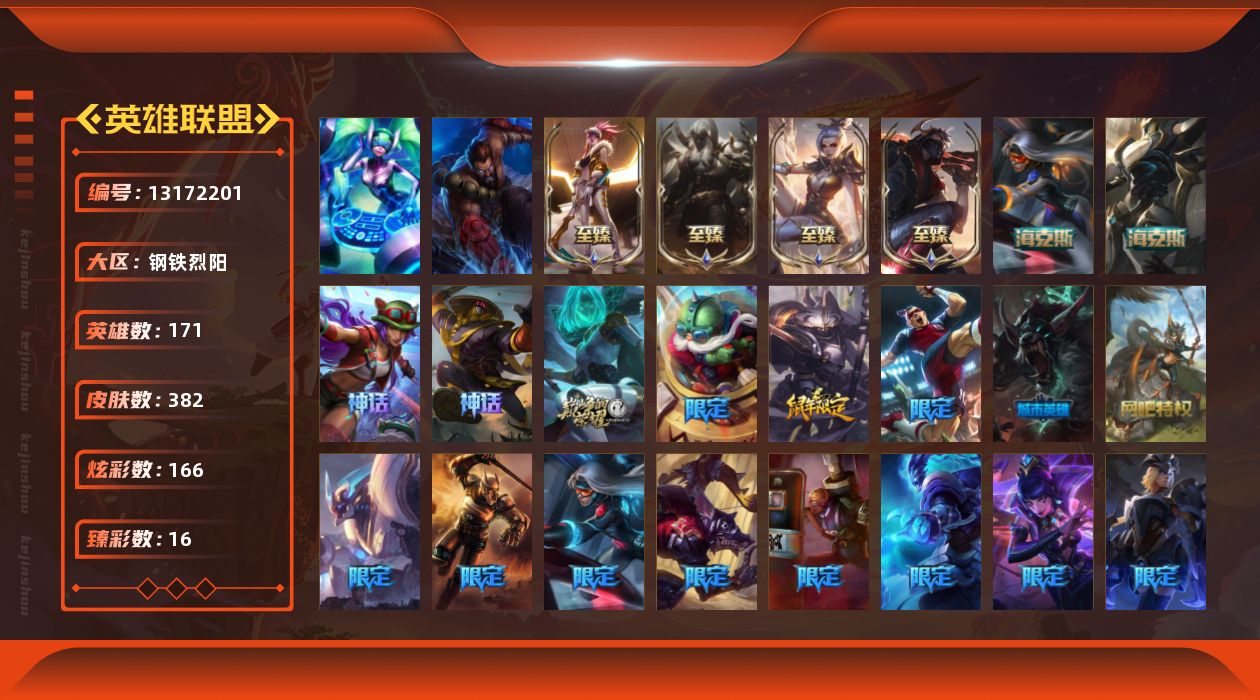 【11088417】[13172201]t29243【钢铁烈阳】382皮肤 166炫彩 16臻彩 12神话/55限定/40传说/171英雄 账号等级:520 单双排段位:铂金【重要头像】爱情之歌 春晖神女拉克丝 KDA萨勒芬妮 小智 不错哦 灌篮高手诺手炫彩头 【重要皮肤】西部魔影猎天使恶魔泰隆至臻 KDA阿卡丽至臻 玉剑传说武剑仙至臻 腥红之月亚托克斯至臻 腥红之月亚托克斯