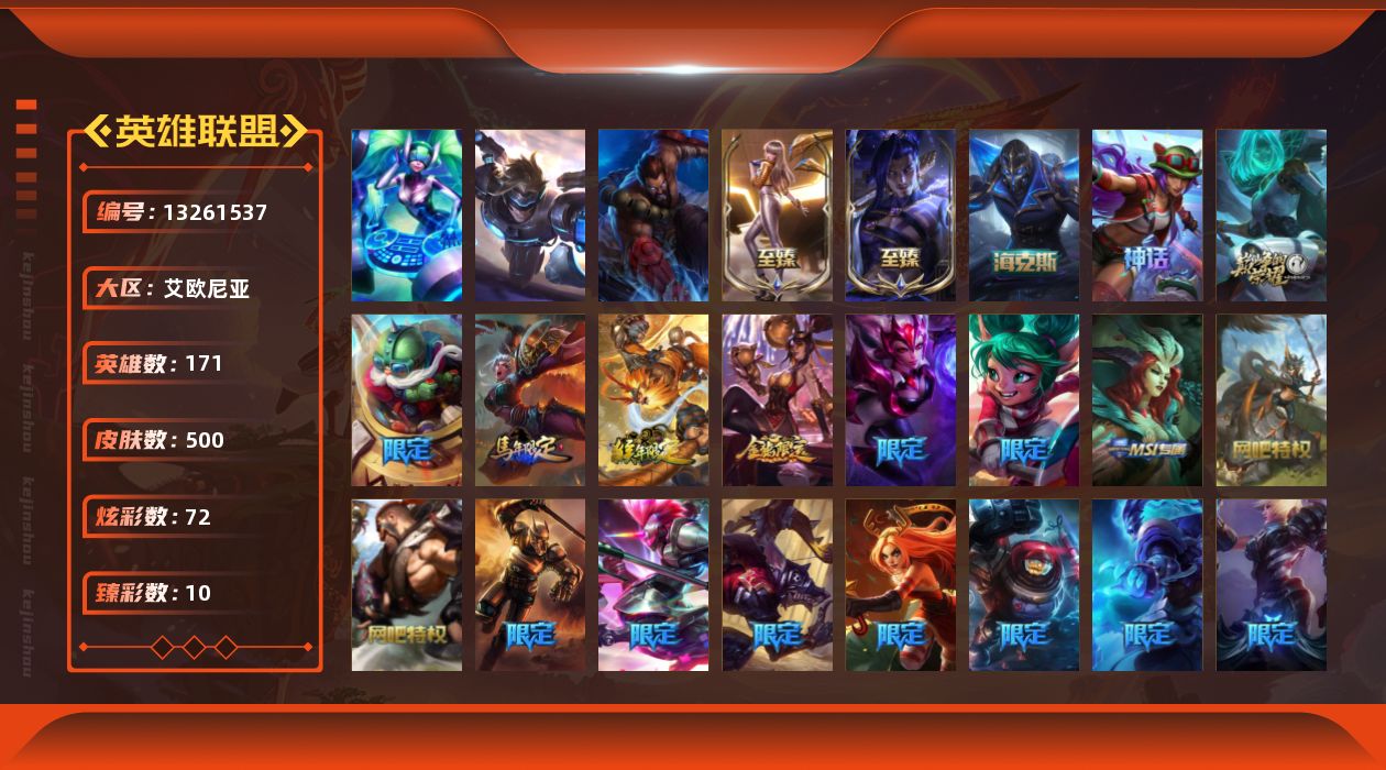 【11090774】[13261537]t29401 皇冠账号【艾欧尼亚】500皮肤 72炫彩 10臻彩 6神话/90限定/36传说/171英雄 账号等级:881 单双排段位:黄金 【重要头像】心型钥匙 觅心之翼奎因 两仪无极 击拳 烈焰美人薇恩 【重要皮肤】至高天奎桑提至臻 KDA一代卡莎至臻 胜利剑圣易 胜利女神娑娜 胜利之王泰达米尔 舞会公主安妮 钢铁军团拉克丝