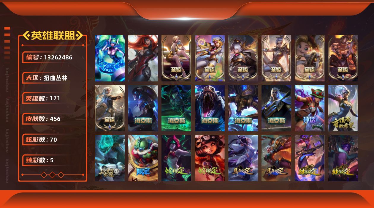 【11091028】[13262486]t29398【扭曲丛林】456皮肤 70炫彩 5臻彩 22神话/78限定/46传说/171英雄 账号等级:708【重要头像】爱情之歌 KDA萨勒芬妮 小斗 披萨鸡 送披萨的小姐姐希维尔 至臻奥术师佐伊 【重要皮肤】奥术师佐伊至臻 黑夜使者凯隐至臻 KDA伊芙琳至臻 KDA伊芙琳2022至臻 烈焰美人薇恩至臻 烈焰美人薇恩2022至臻