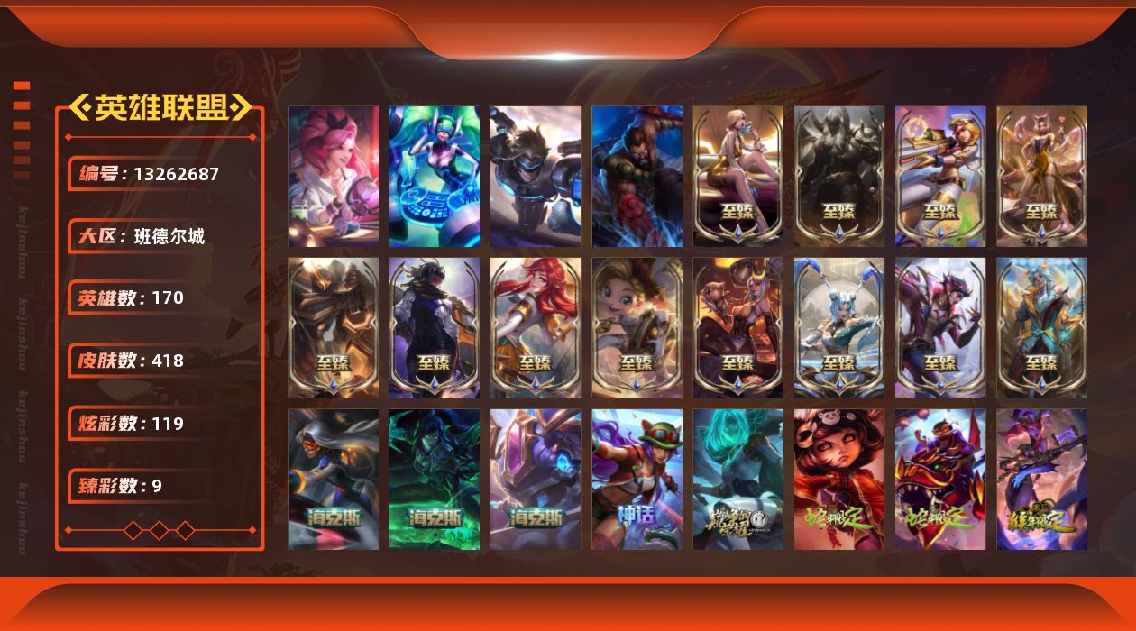 【11091067】[13262687]t29406【班德尔城】418皮肤 119炫彩 9臻彩 24神话/97限定/46传说/170英雄 账号等级:616 云顶神话:1 单双排段位:铂金【重要头像】SSG霞 萨勒芬妮超级巨星 萨勒芬妮独立音乐人 泳池派对凯特琳 SSG伊泽瑞尔 烈焰美人薇恩 披萨鸡 星界起源 征服者韦鲁斯 【重要皮肤】机神玄武盖伦至臻 天龙之子伊泽瑞尔至臻