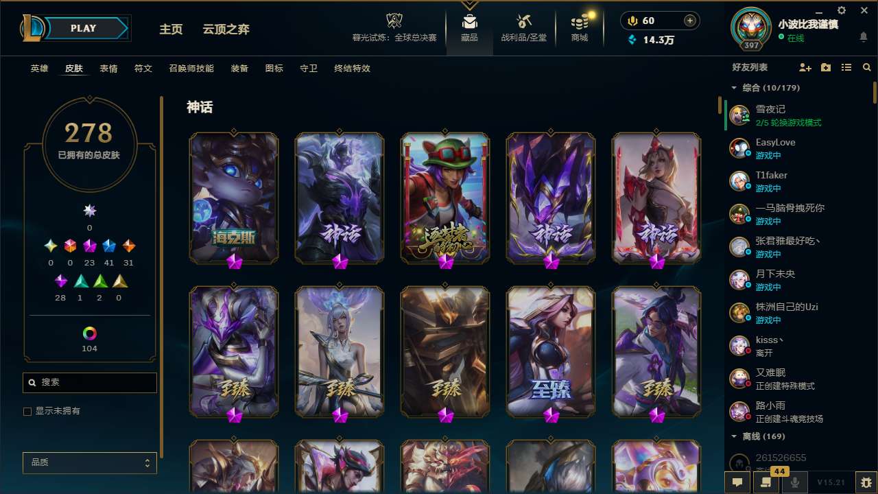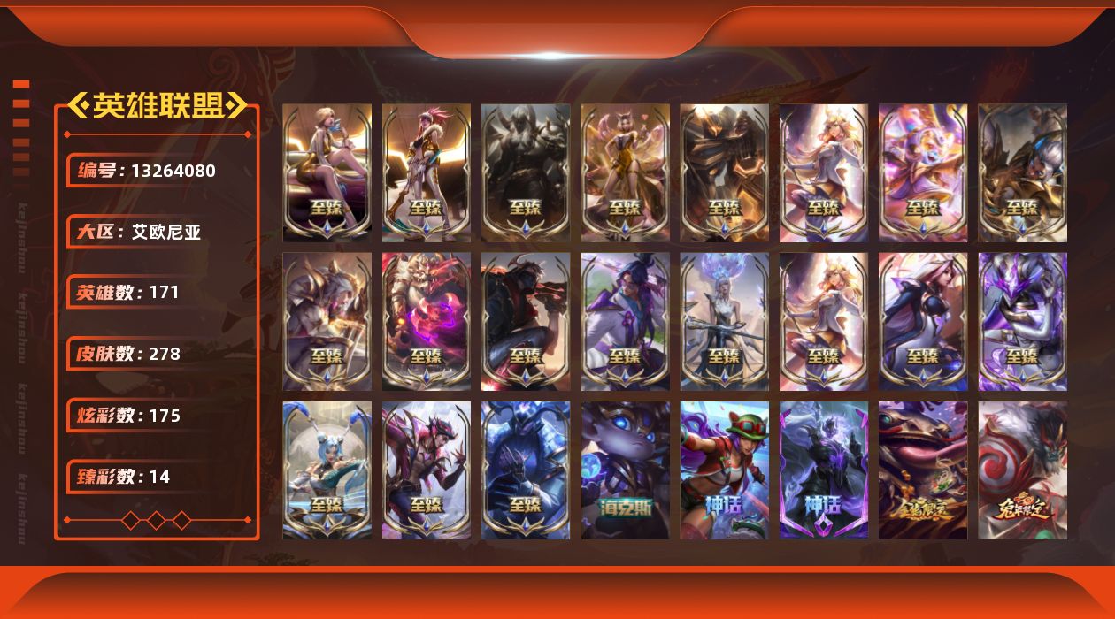 【11091447】[13264080]t29415【艾欧尼亚】278皮肤 175炫彩 14臻彩 23神话/41限定/31传说/171英雄 账号等级:397 云顶神话:3 单双排段位:白银【重要头像】云顶战斗学院伊泽瑞尔 云顶古琴娑娜 云顶星守阿卡丽 灵魂莲华辛德拉炫彩 水晶圣骑艾希炫彩头 水晶圣骑艾希头 【重要皮肤】机神玄武盖伦至臻 神龙尊者比翼之龙洛至臻 玉剑传说琴仙子至臻