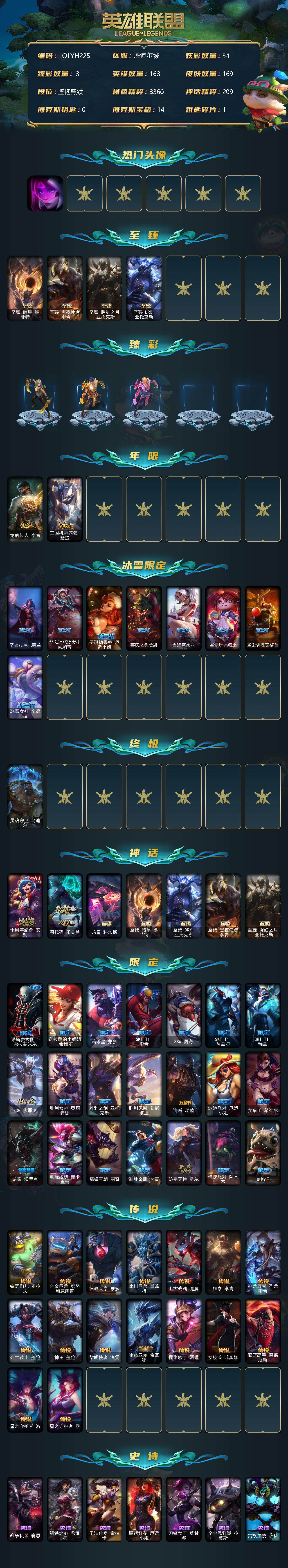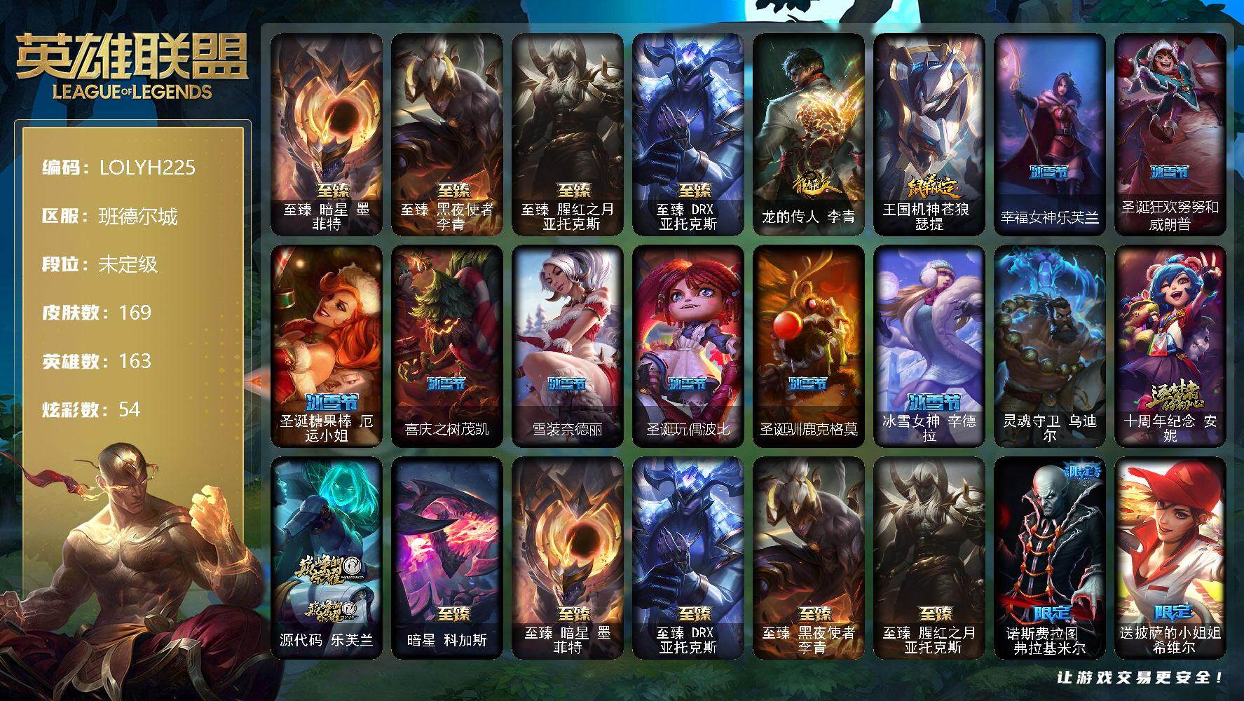 【11091811】【LOLYH225】163英雄/169皮肤/1终极/7神话/31限定/3臻彩/54炫彩/16传说/39史诗/未定级/源计划刀妹/至臻暗星墨菲特/至臻黑夜使者李青/至臻腥红之月亚托克斯/至臻DRX亚托克斯/闭月之颜貂蝉炫金莲华/神龙尊者圣龙李青龙腾云起/神龙尊者圣龙李青登龙/龙的传人李青/王国机神苍狼瑟提/幸福女神乐芙兰/圣诞狂欢努努和威朗普/圣诞糖果棒厄运小姐/喜庆之树茂凯/