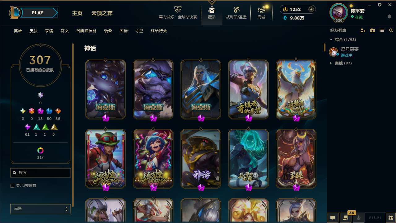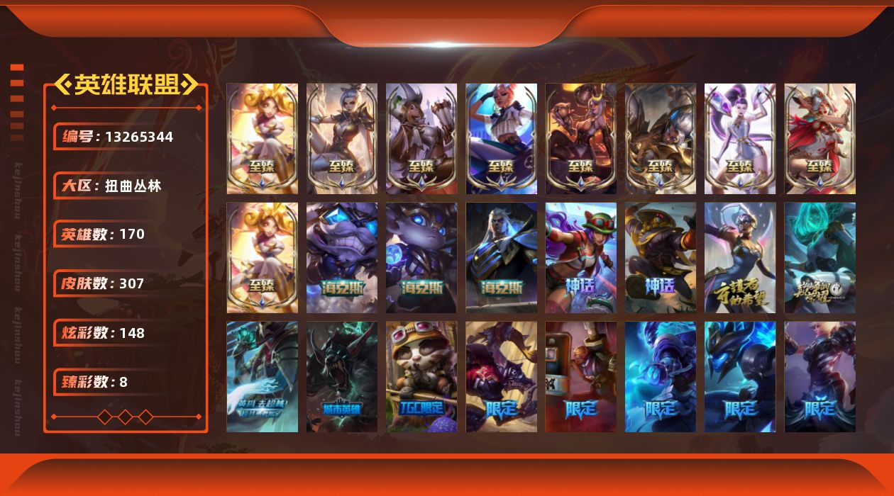【11091812】[13265344]t29436【扭曲丛林】307皮肤 148炫彩 8臻彩 18神话/50限定/36传说/170英雄 账号等级:520 单双排段位:铂金【重要头像】春晖神女拉克丝 KDA萨勒芬妮 青花瓷伊泽瑞尔 战斗学院伊泽瑞尔神话炫彩 不错哦 圣诞捣蛋鬼金克丝 至臻神凰行者霞 【重要皮肤】神凰行者烈羽焰凰霞至臻 神龙尊者炎龙瑟提至臻 KDA二代卡莎至臻